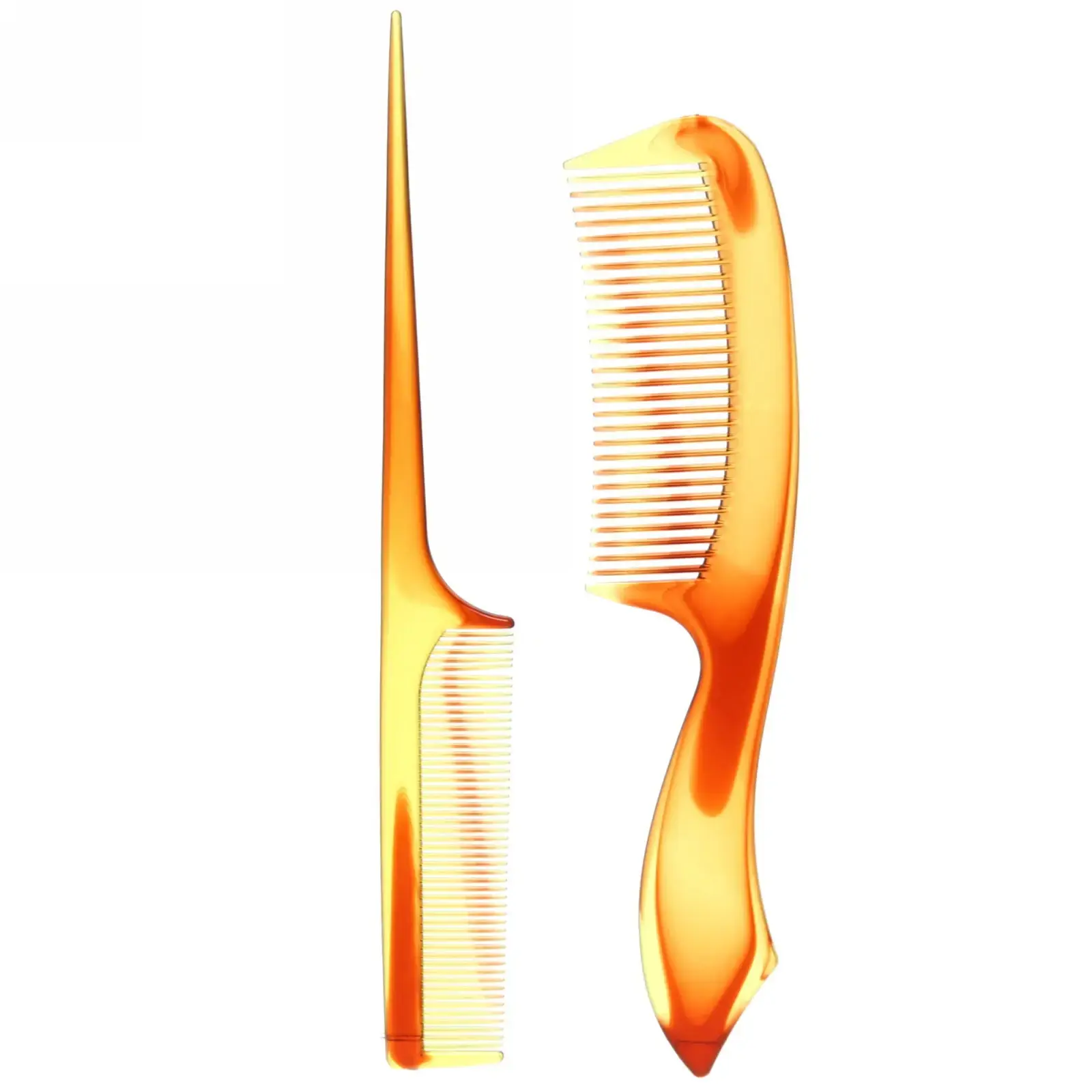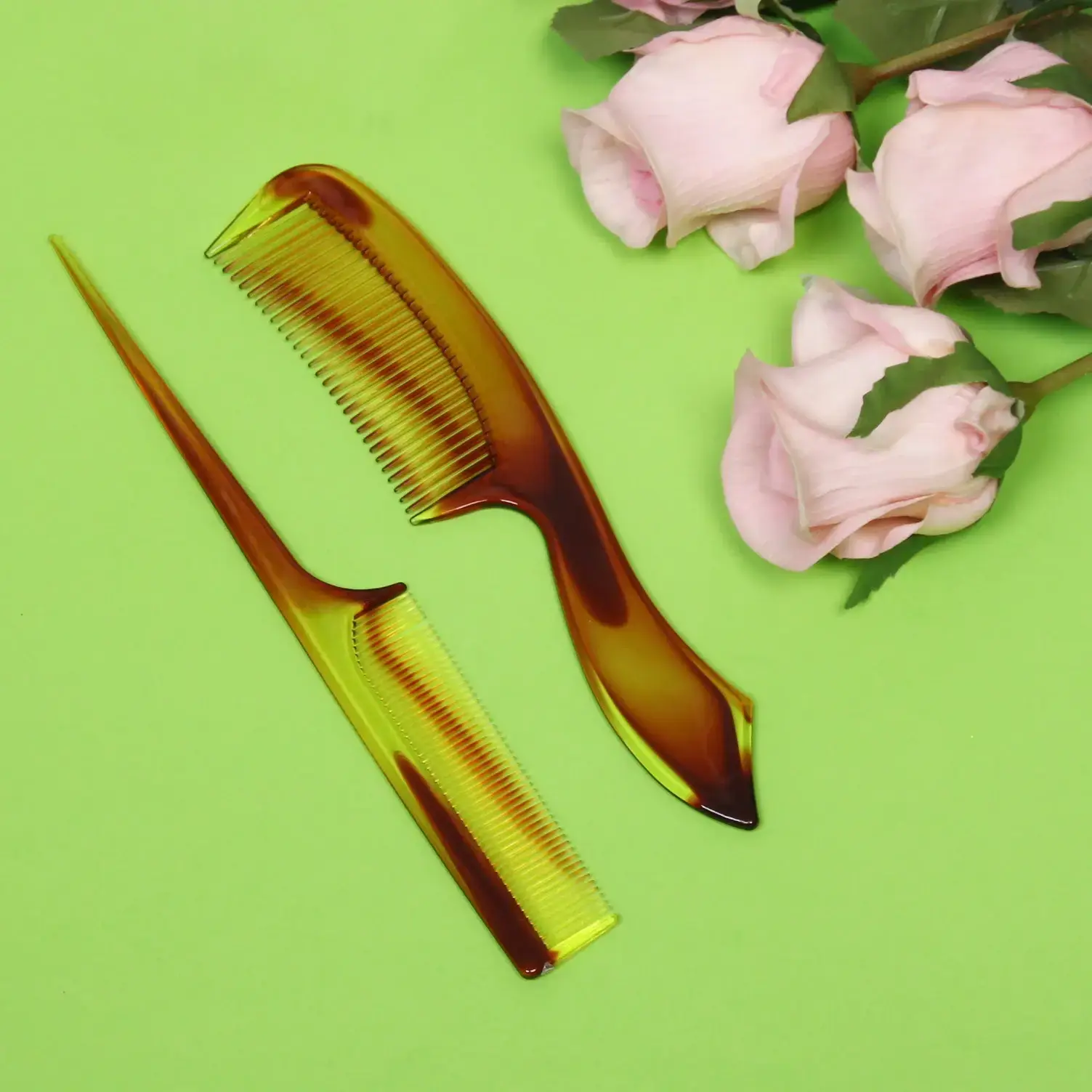 Расчески в наборе включают одну с длинным хвостом для разделения волос и широкими зубцами, а также вторую с более тонкими зубцами для укладки. Они выполнены из качественного пластика, что обеспечивает долговечность и легкость в использовании. Прозрачный оранжевый цвет добавляет стильный акцент, а гладкая поверхность и обтекаемая форма делают процесс расчесывания комфортным.