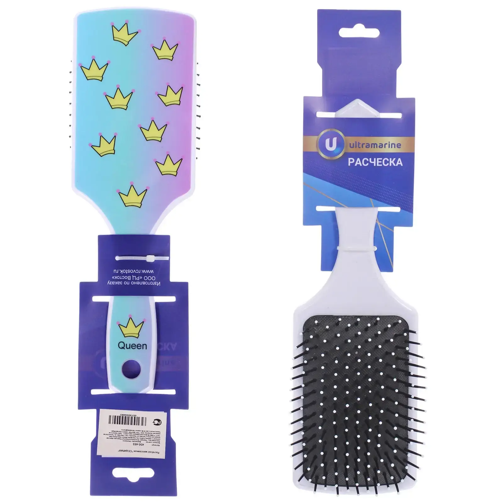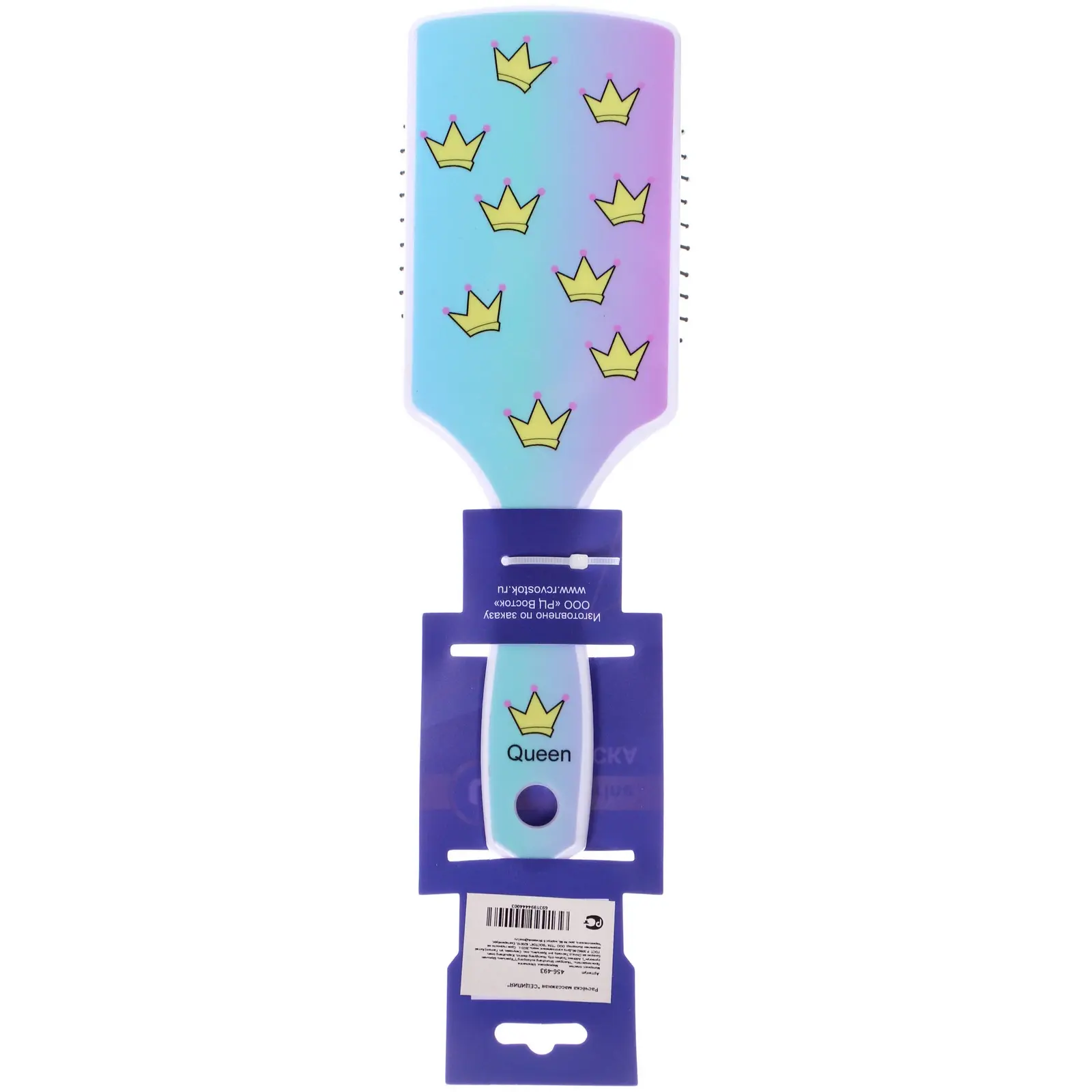 Расческа выполнена в градиентных цветах от светло-голубого до фиолетового, что добавляет ей яркости и привлекательности. Белая ручка с надписью «Queen» придает изделию изысканный вид. Упаковка расчески выполнена в фиолетовых и синих тонах, что делает ее отличным подарком для близких. Не упустите возможность сделать уход за волосами более приятным и эффективным!