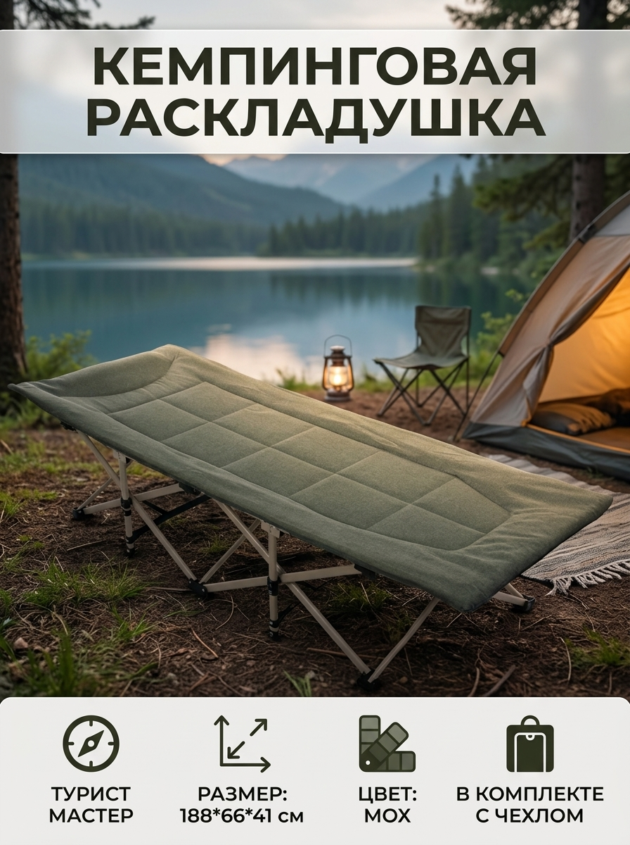 Эта раскладушка предназначена для кемпинга, пикников и дачных выездов. Она легко раскладывается и складывается, что делает её идеальным выбором для активного отдыха. Подходит как для взрослых, так и для детей, обеспечивая комфортное место для сна или отдыха.