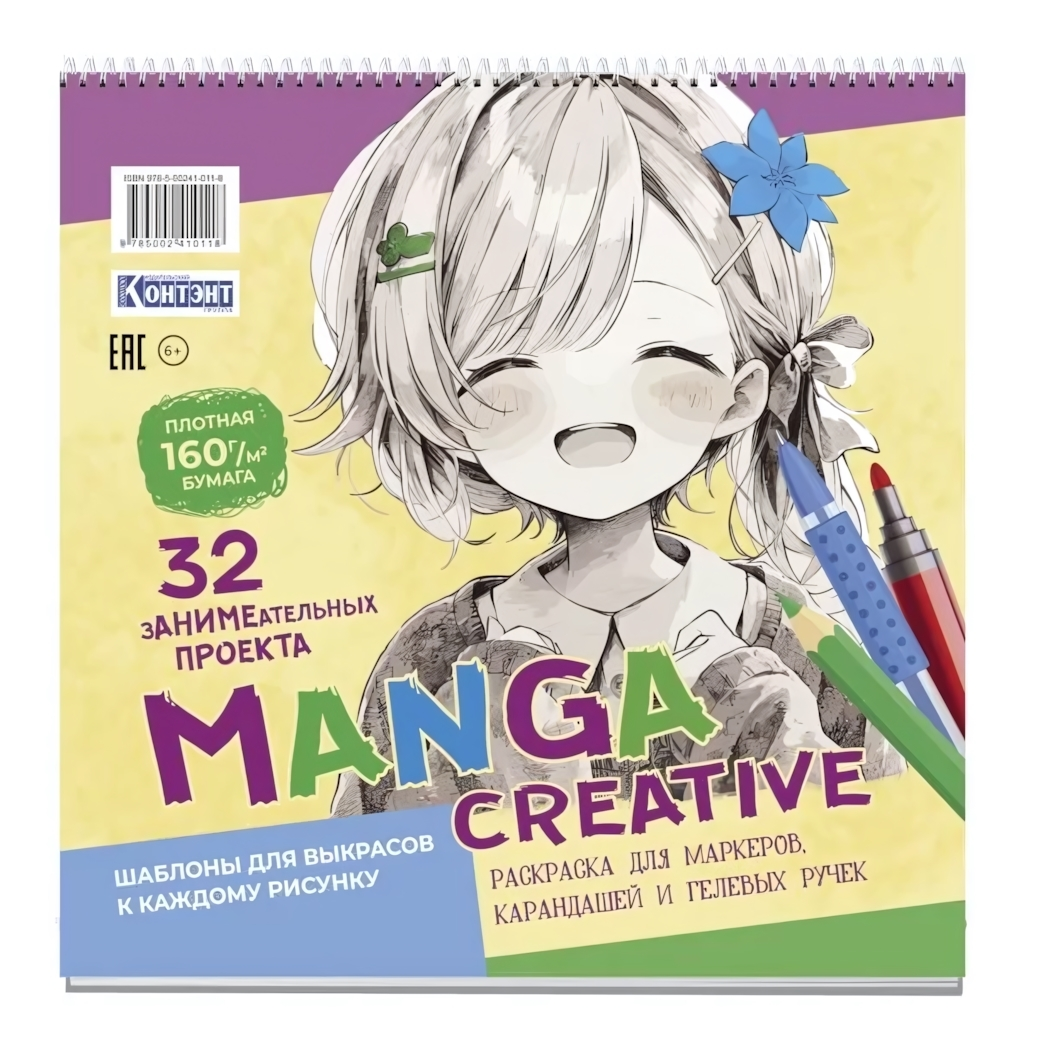 Размер раскраски стандартный, что делает её удобной для использования. Обложка оформлена в ярком аниме-стиле с изображением улыбающейся девочки, что привлечет внимание и создаст позитивное настроение. Плотность бумаги 160 г/м² обеспечивает отличное качество раскрашивания, а также долговечность страниц.