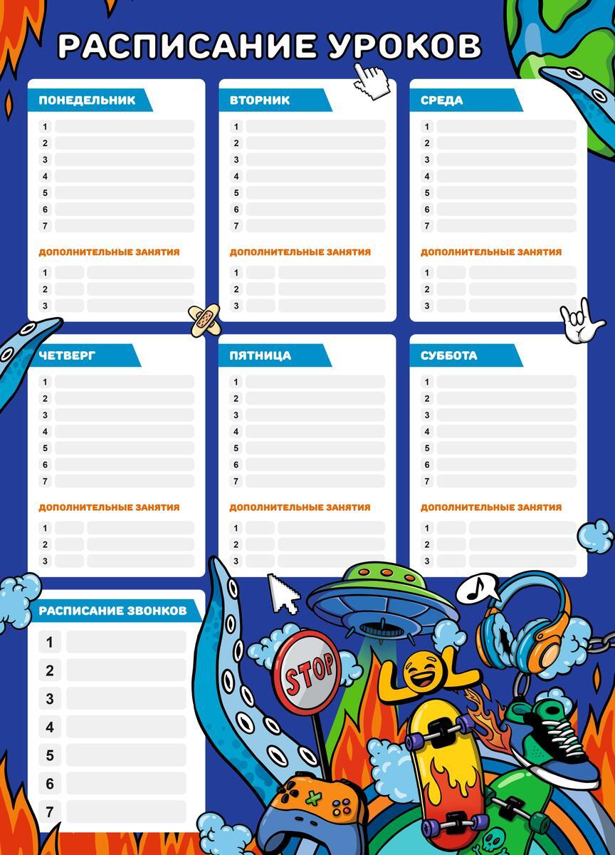 Планируйте занятия с удовольствием! Яркое расписание с космическим дизайном создаст мотивацию для школьников и студентов, а продуманная структура поможет не пропустить ни одного урока.