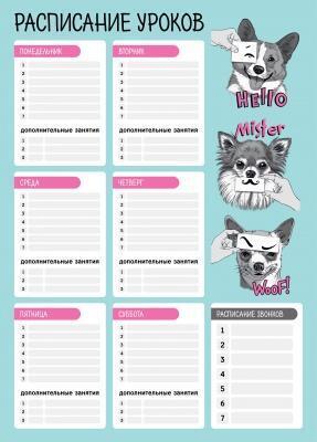Сделайте учебный процесс организованным и веселым с нашим расписанием уроков формата А3! Яркий дизайн с милыми корги создаст позитивное настроение и поможет вашему ребенку с удовольствием планировать свои занятия. Удобные поля для заполнения предметов и расписания звонков сделают планирование простым и эффективным.