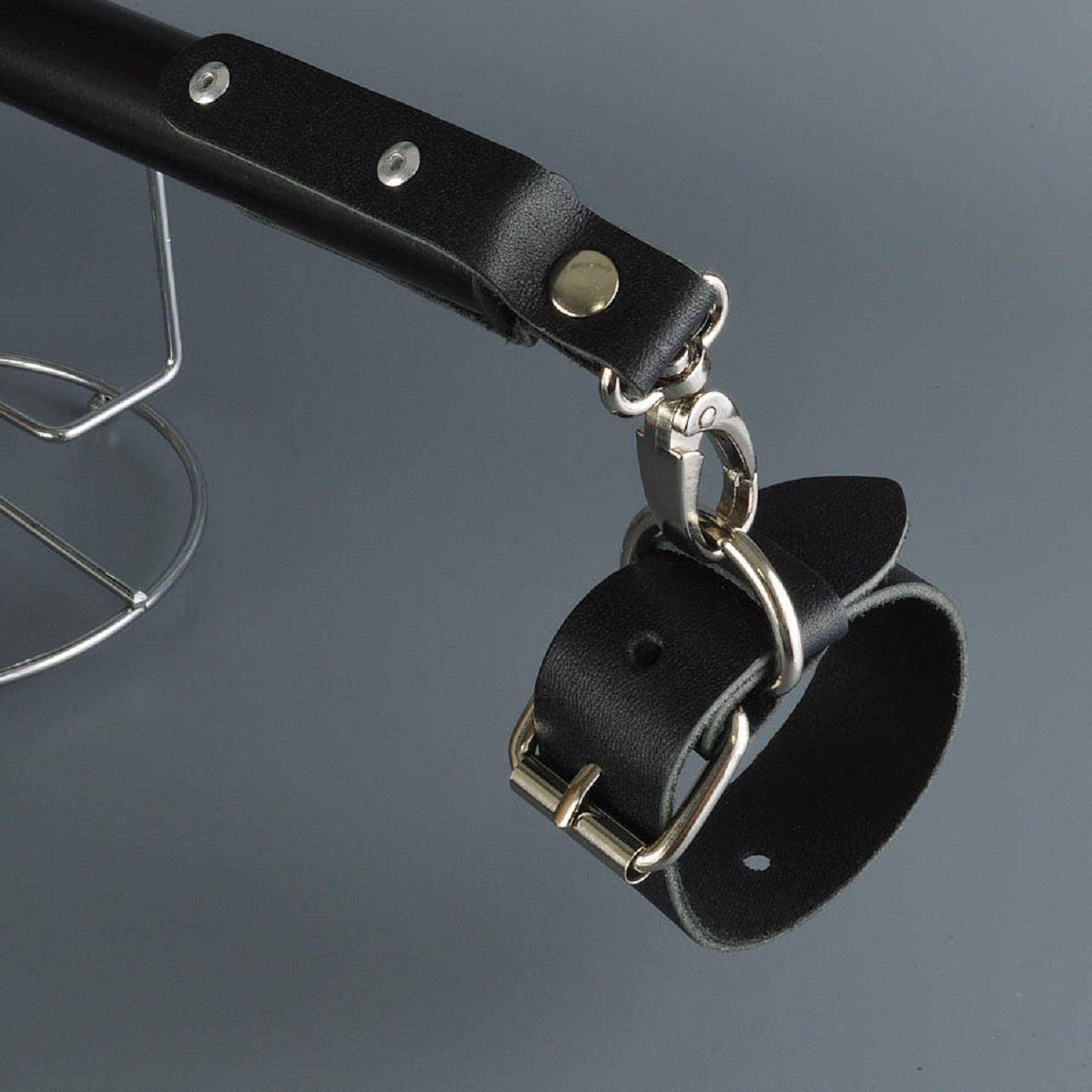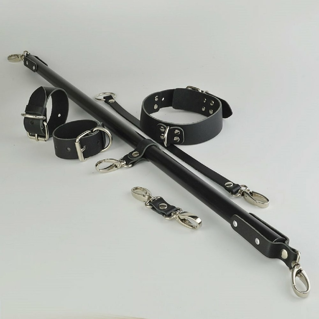 Основой комплекта является прочная металлическая распорка длиной 55 см. Цилиндрический стержень черного цвета дополнен тремя точками крепления с надежными карабинами, имеющими износостойкое никелевое покрытие. Элементы фиксации выполнены из натуральной толстой кожи серии «Новичек». Этот материал отличается высокой прочностью и мягкостью: кожа не натирает и комфортно прилегает к телу, при этом выдерживая значительные нагрузки.
