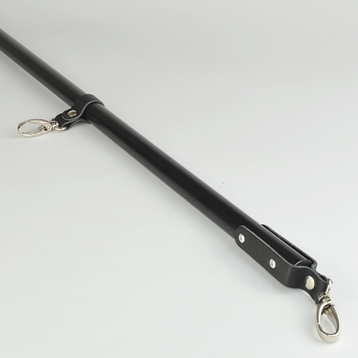 Основой изделия служит прочный металлический стержень черного цвета цилиндрической формы. Он выдерживает значительные нагрузки и обеспечивает стабильность конструкции при натяжении. На распорке установлены три крепления, изготовленных из плотной натуральной кожи. Кожаные элементы надежно зафиксированы металлическими заклепками, что гарантирует безопасность во время сессии.