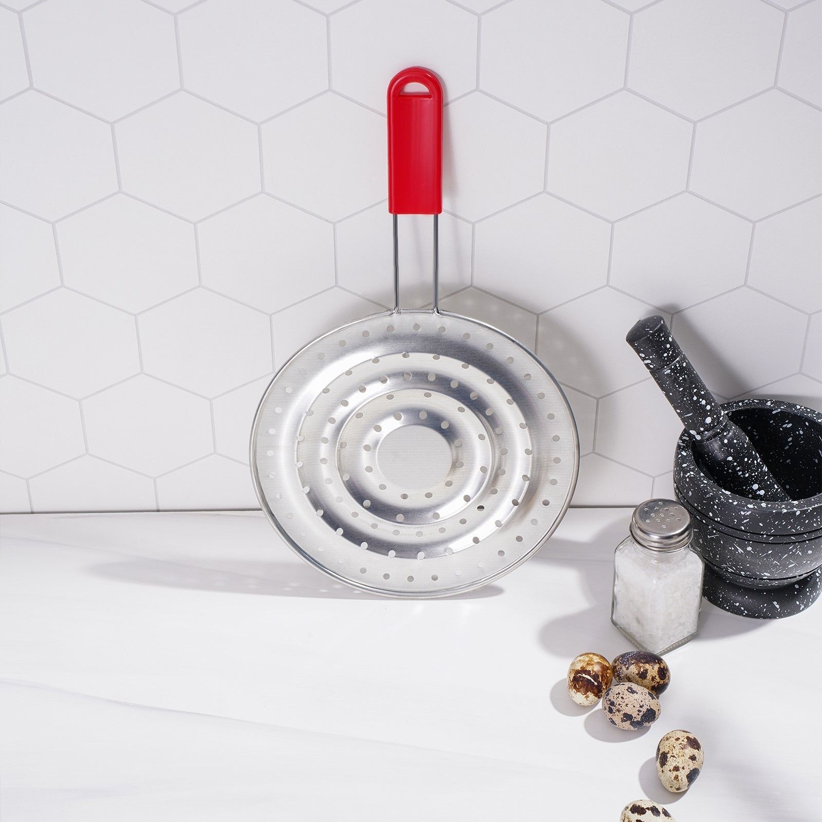 Рассекатель выполнен из нержавеющей стали, что обеспечивает долговечность и легкость в уходе. Красная ручка не только привлекает внимание, но и удобна для захвата. Этот товар станет отличным дополнением к вашей кухонной утвари и поможет вам готовить с удовольствием.