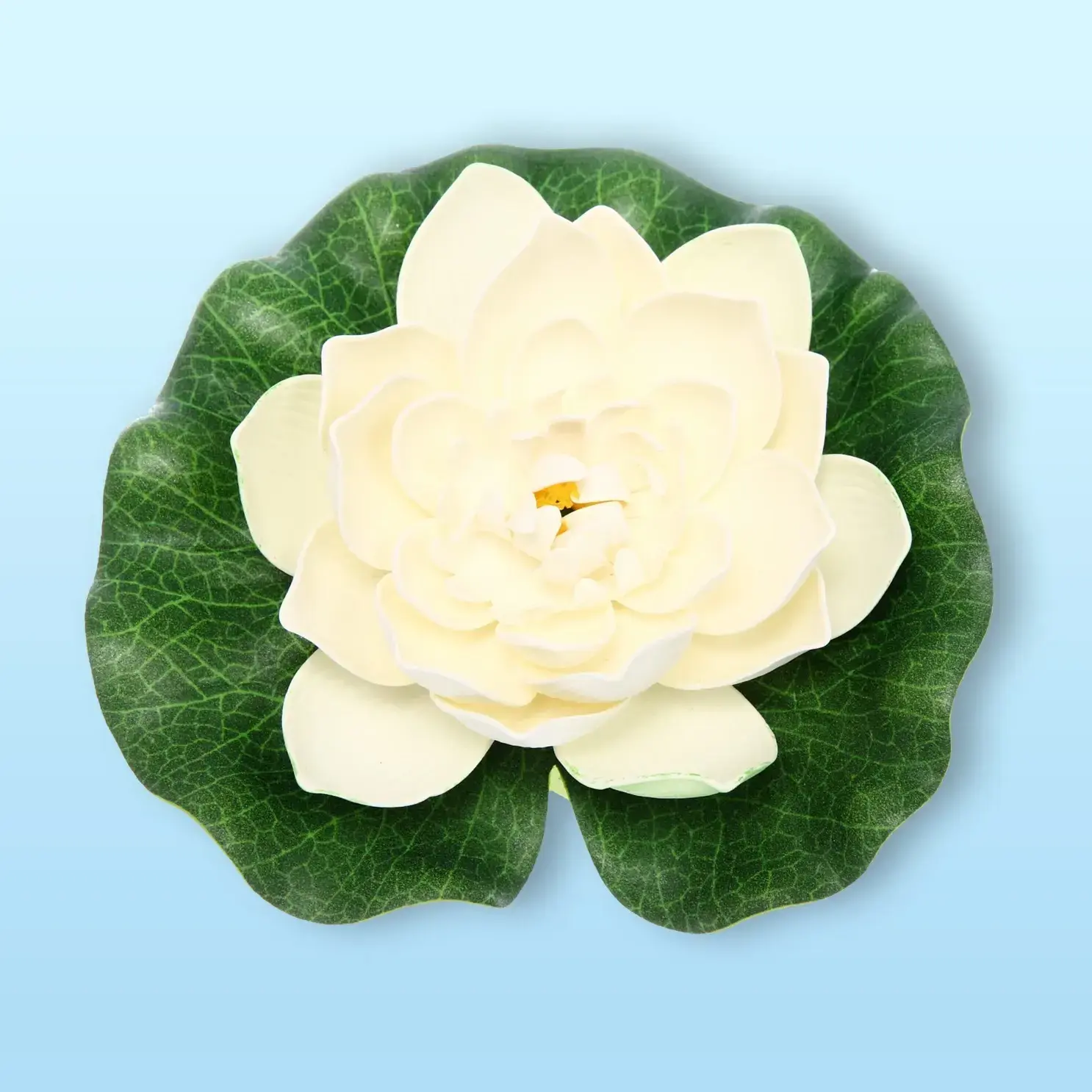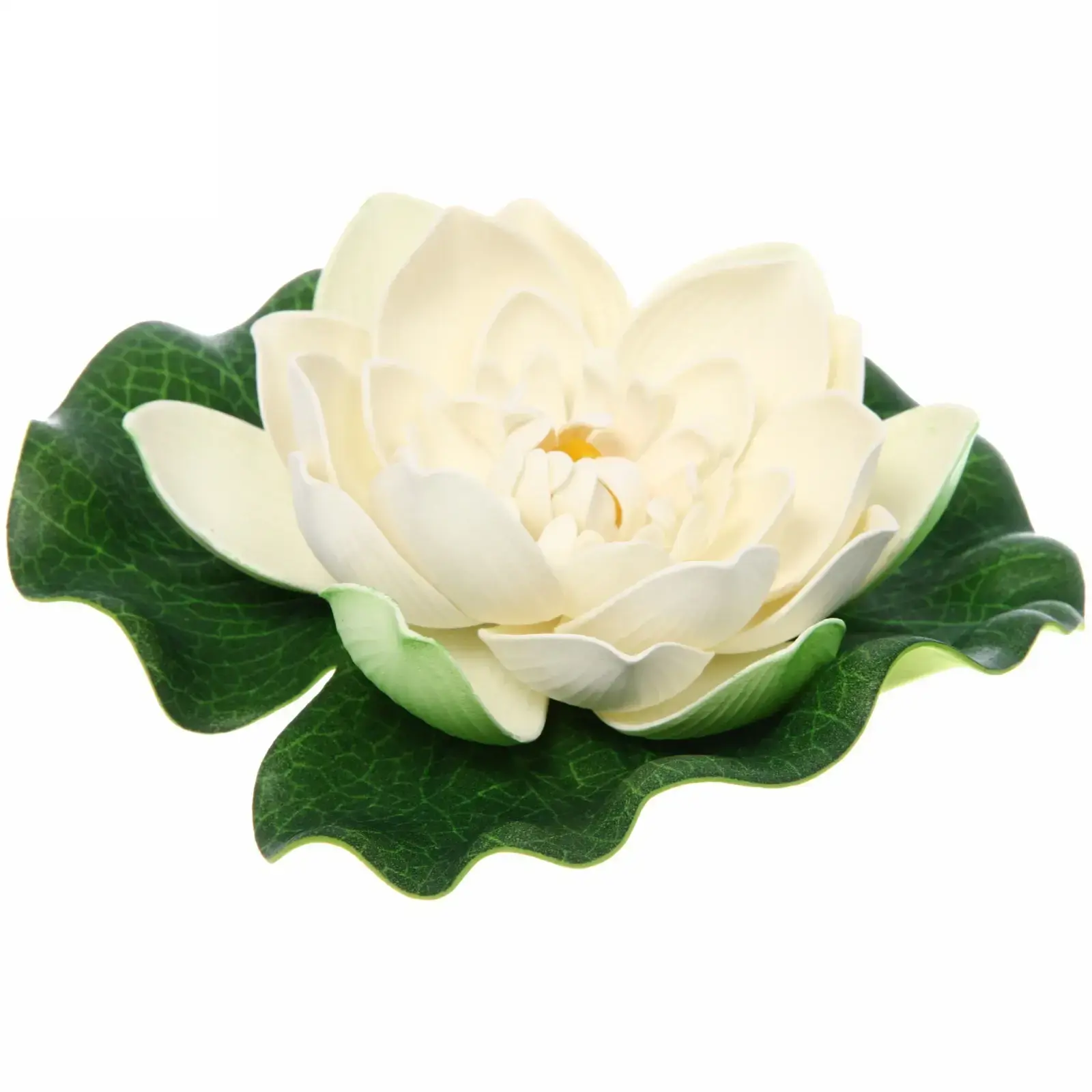 Размер цветка составляет 17 см в диаметре, а белый цвет с легким желтым оттенком в центре придаёт ему особую элегантность. Листья выполнены в зеленом цвете с текстурой, имитирующей натуральные листья, что добавляет реалистичности. Искусственная лилия «Кувшинка Розитта» — это идеальный выбор для тех, кто ценит красоту и практичность в одном изделии.