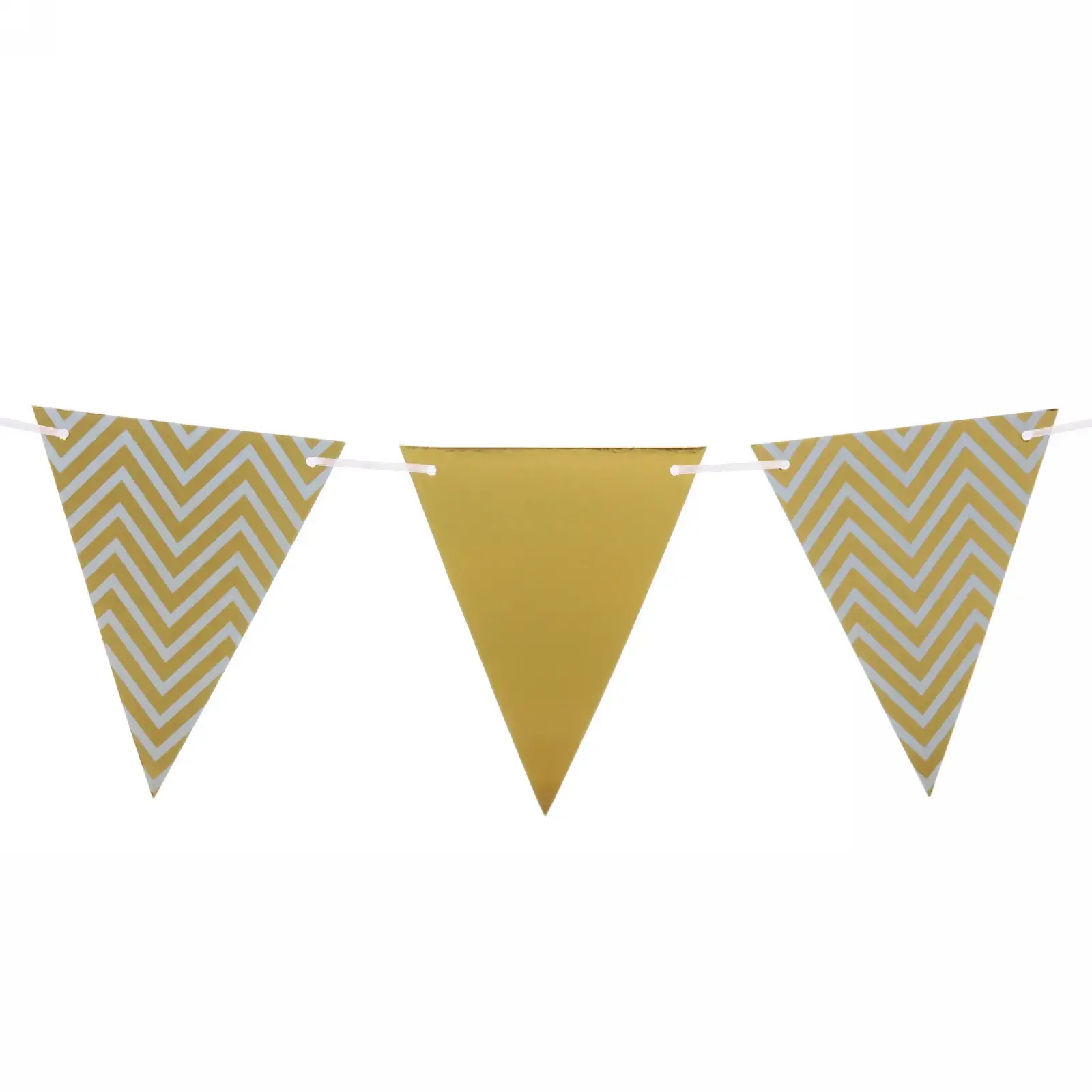 Треугольные флажки размером 7 см шириной чередуются в двух дизайнах: однотонные золотистые и с бело-золотым зигзагообразным узором. Тонкая белая веревка обеспечивает удобное крепление.