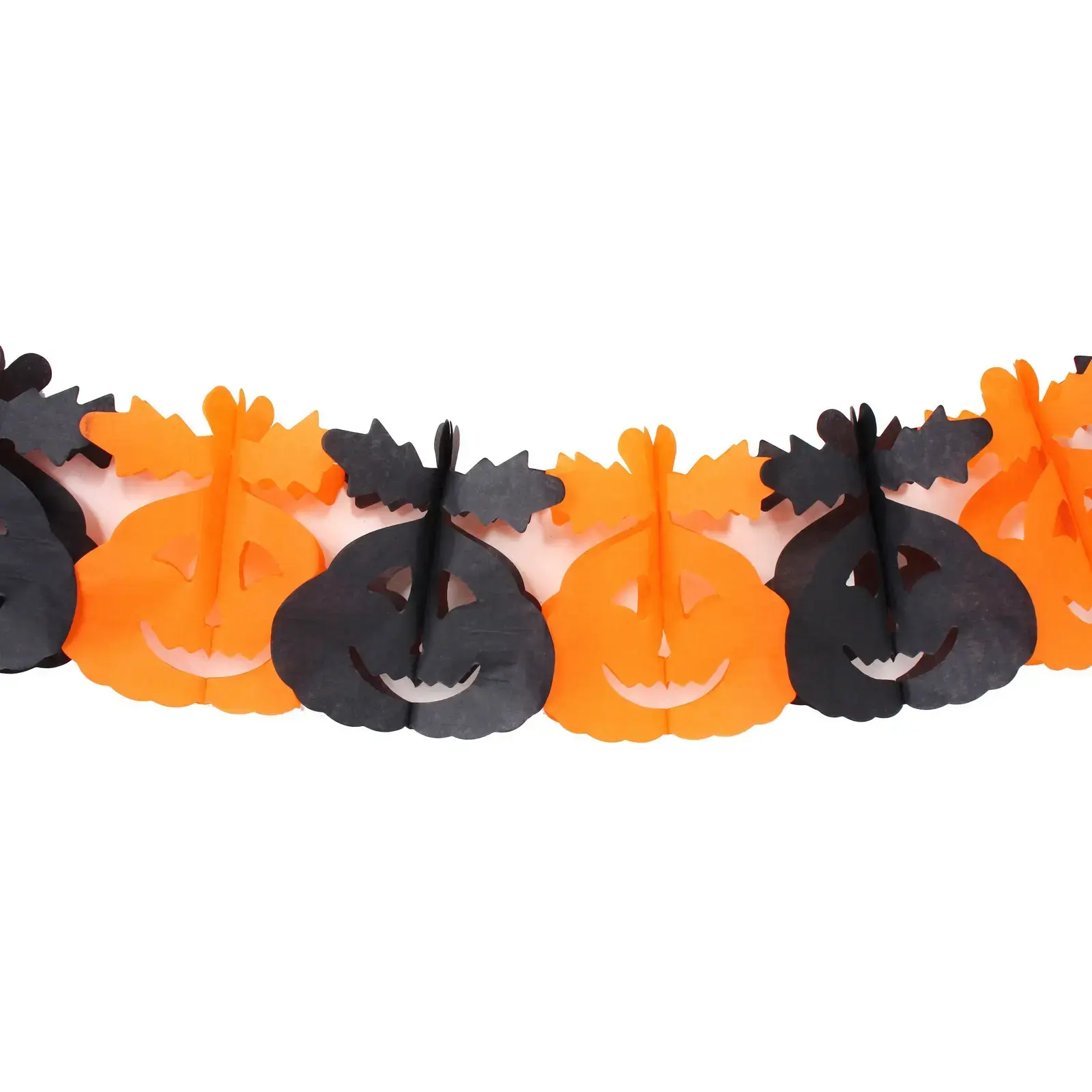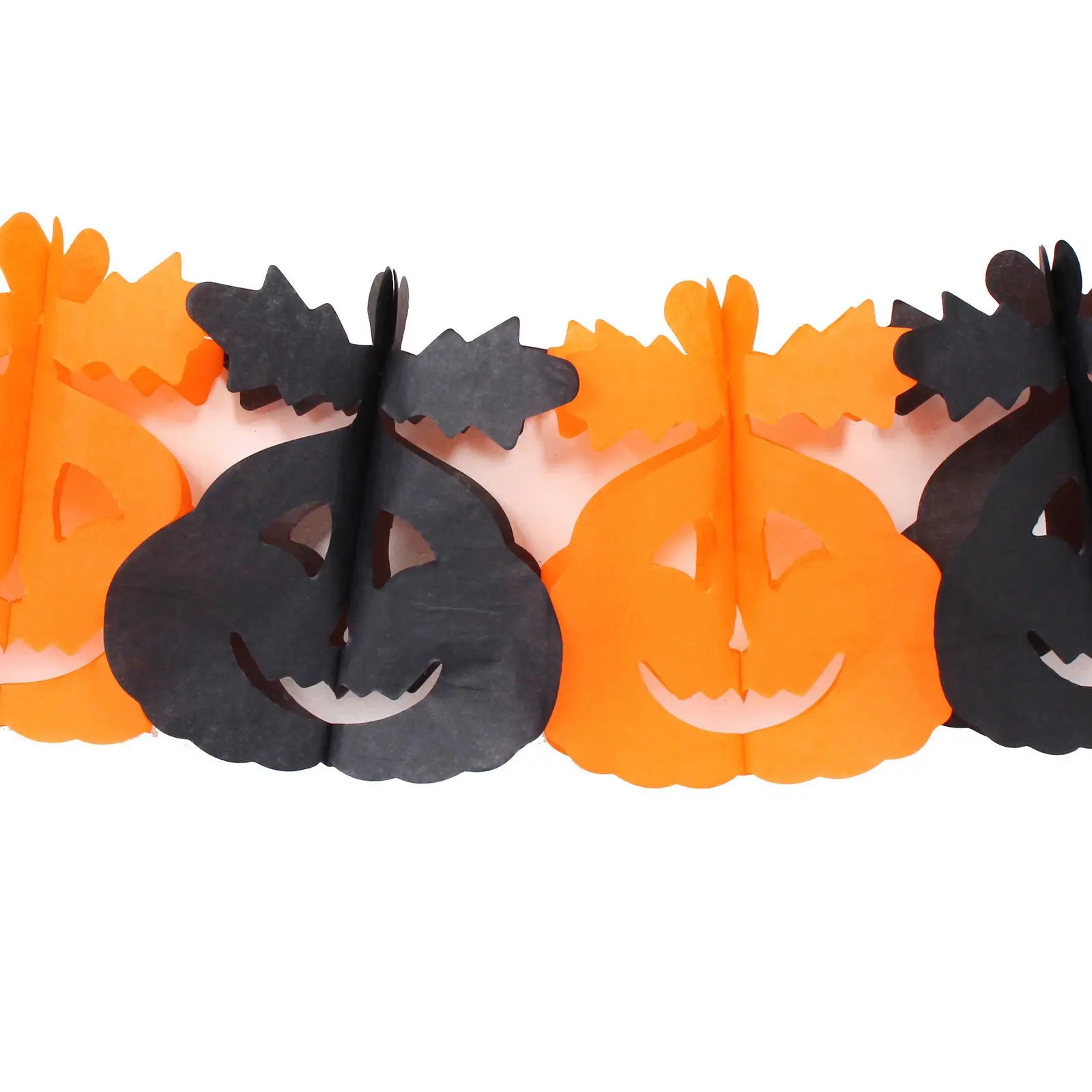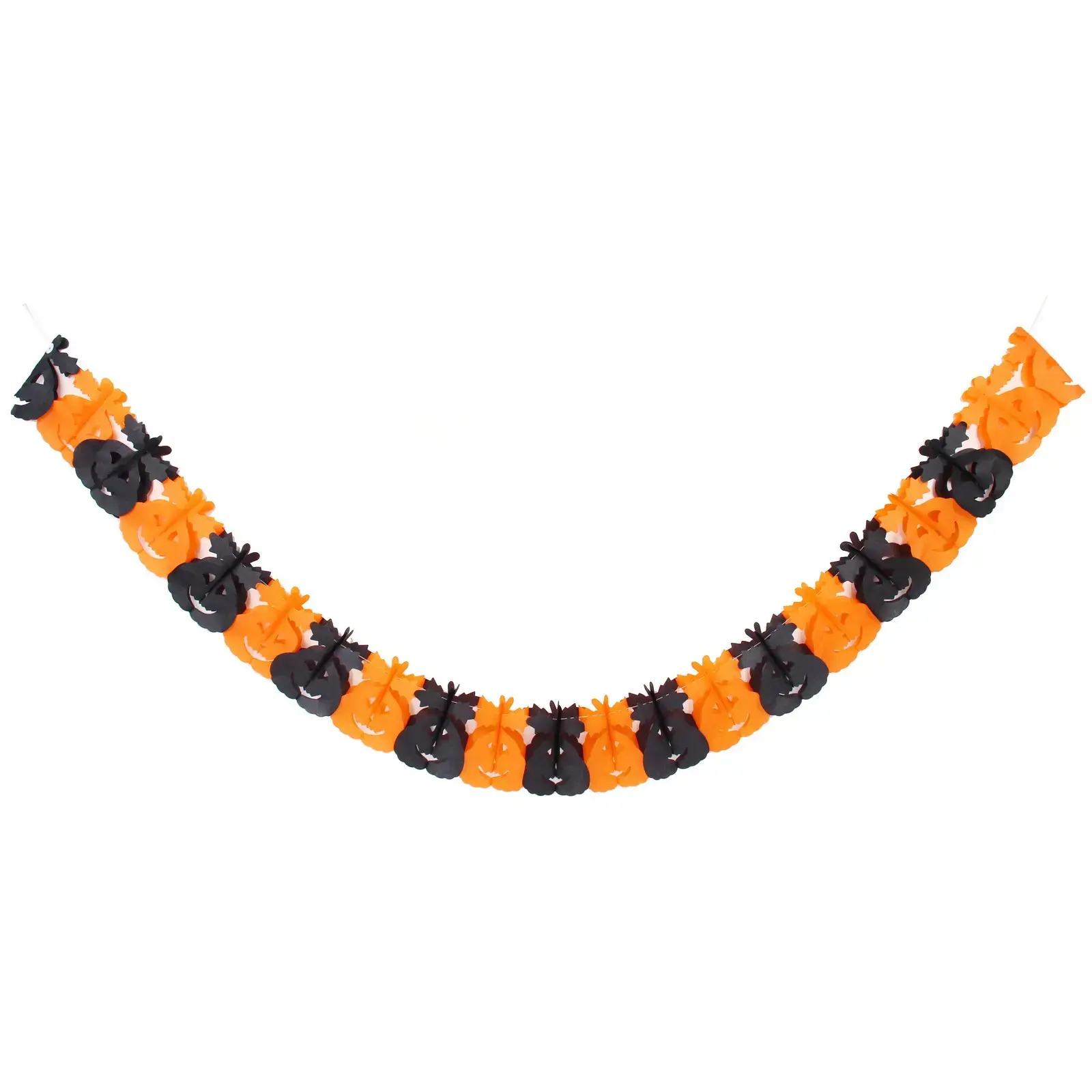 Размер гирлянды составляет 3 метра, что позволяет украсить большие пространства. Каждый элемент гирлянды выполнен с прорезанными деталями, создающими выразительные лица тыкв, что добавляет игривости и веселья. Растяжка легко соединяется с помощью белой нити, что делает ее удобной в использовании.