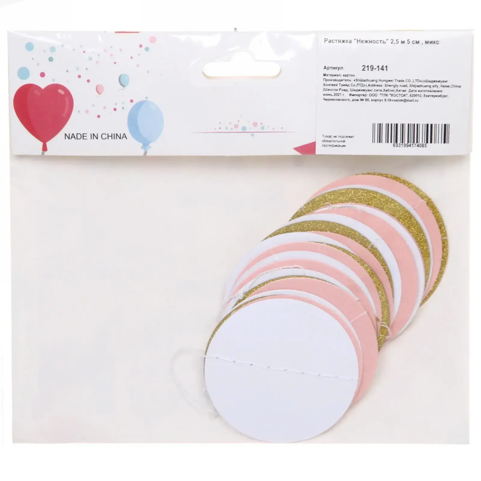 Создайте атмосферу уюта и радости с растяжкой «Нежность», которая станет ярким акцентом на любом мероприятии. Эта гирлянда длиной 2,5 метра и диаметром кругов 5 см выполнена из качественного картона и представлена в нежных цветах: золотом, розовом и фиолетовом. Она не только украсит ваше пространство, но и добавит оригинальности в оформление.
