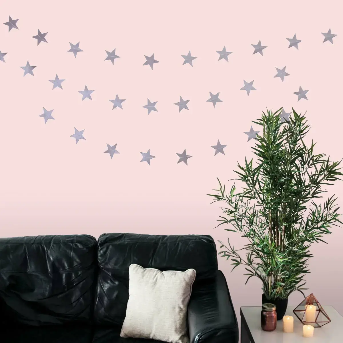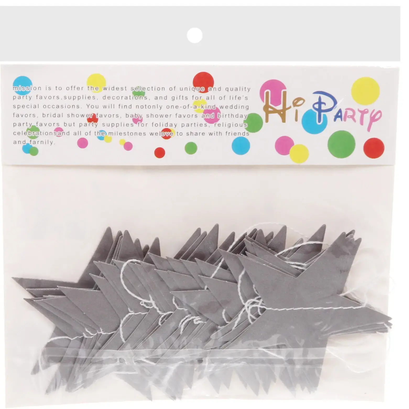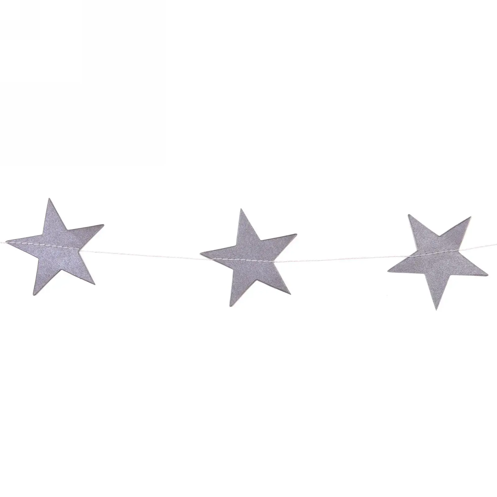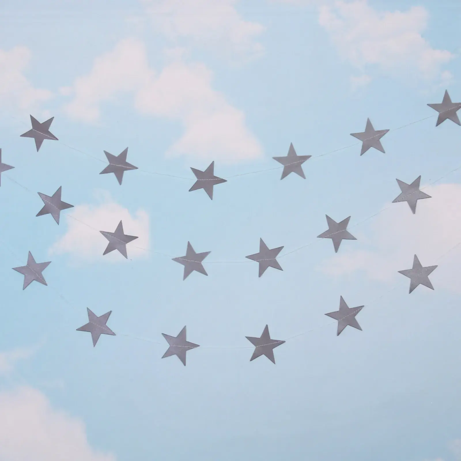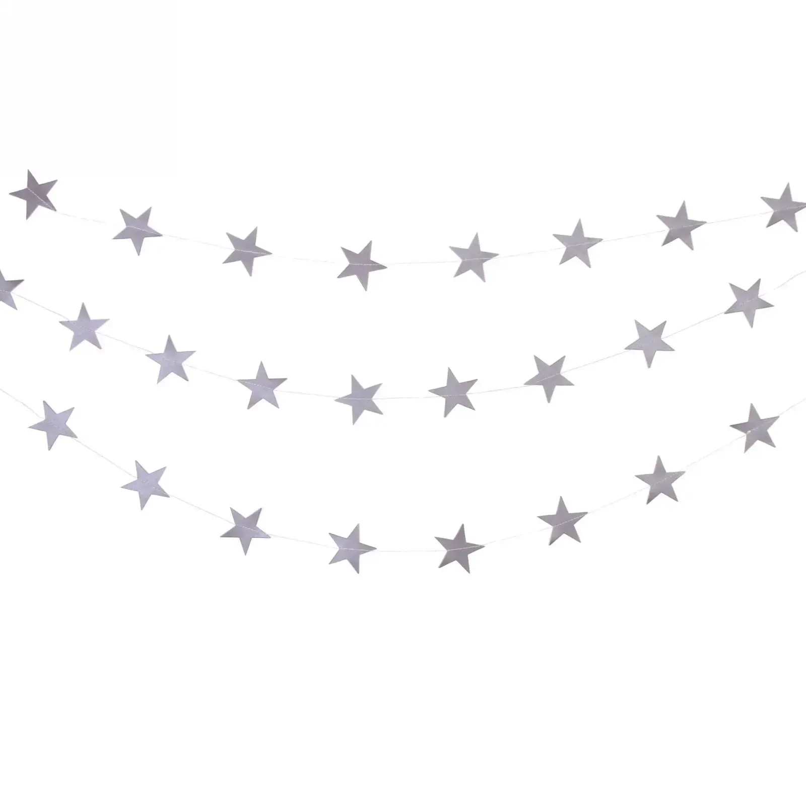 Гирлянда состоит из нескольких звезд, подвешенных на тонкой леске, что создает эффект легкости и воздушности. Звезды имеют пятиконечную форму и выполнены из бумаги, что делает их легкими и безопасными для использования в любом интерьере. Длина гирлянды составляет 4 метра, что позволяет украсить большие пространства.