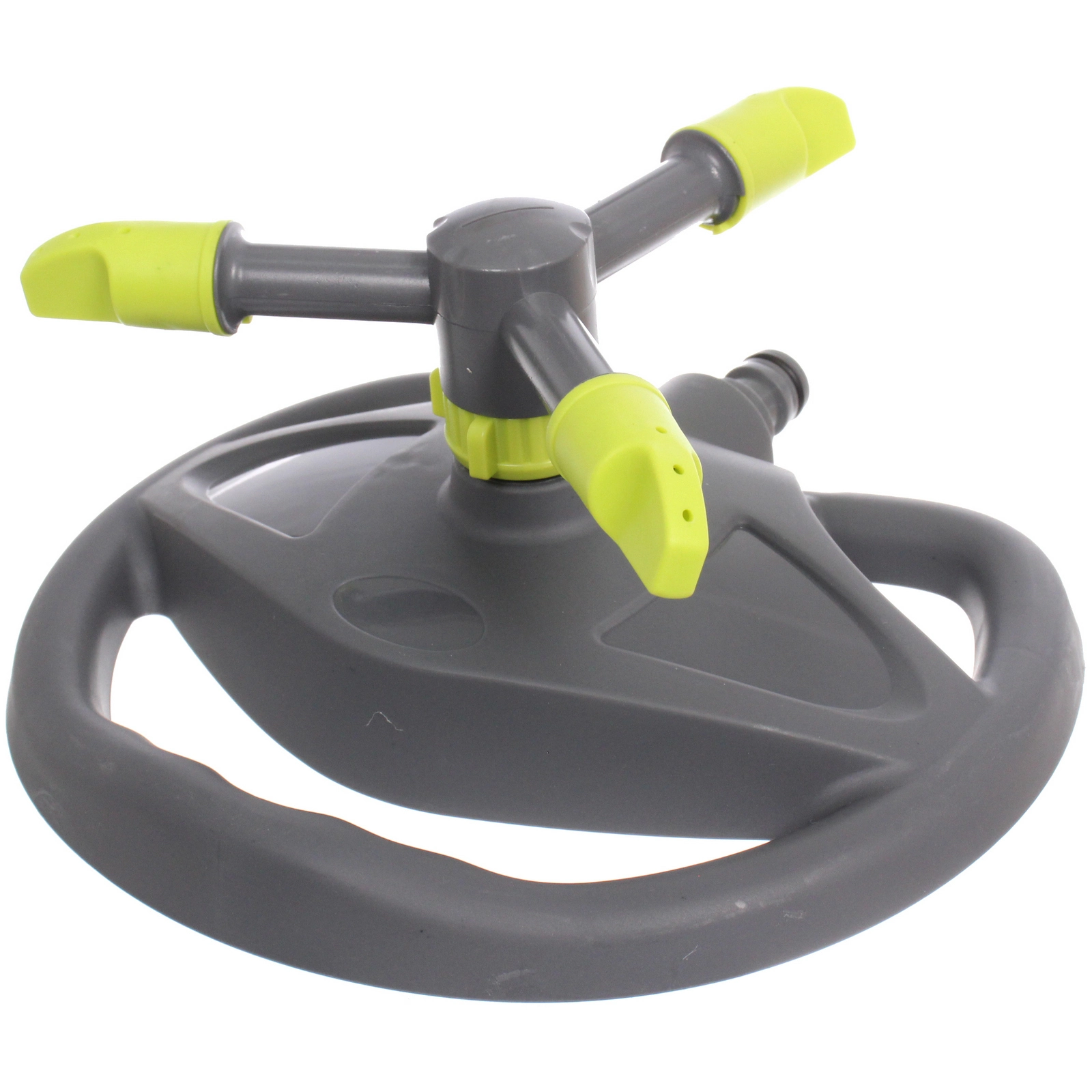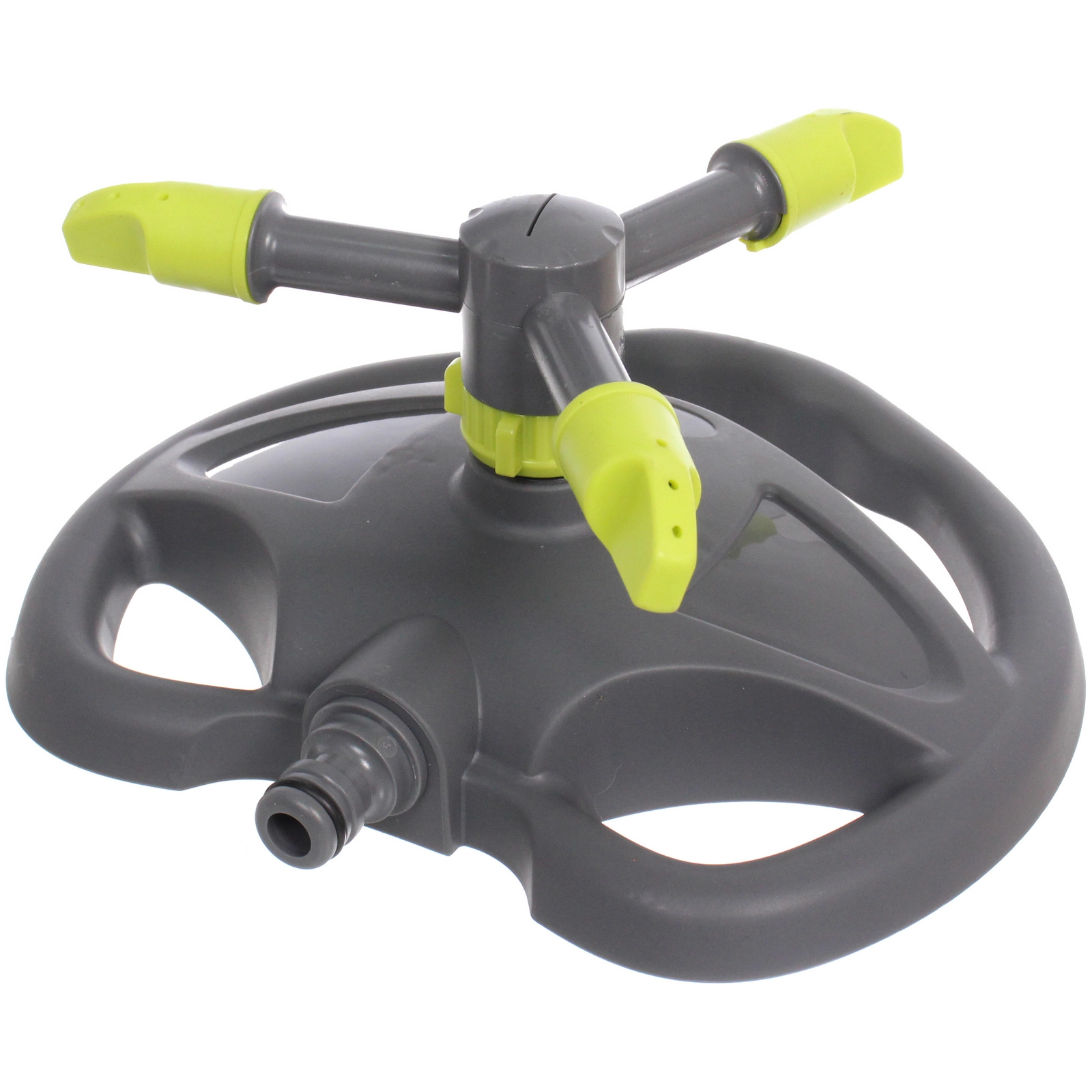 Горизонтальная система с тремя лейками охватывает большую площадь, что делает модель эффективной для полива клумб, газонов и грядок. Вращающаяся форсунка обеспечивает качественное распыление воды во всех направлениях.