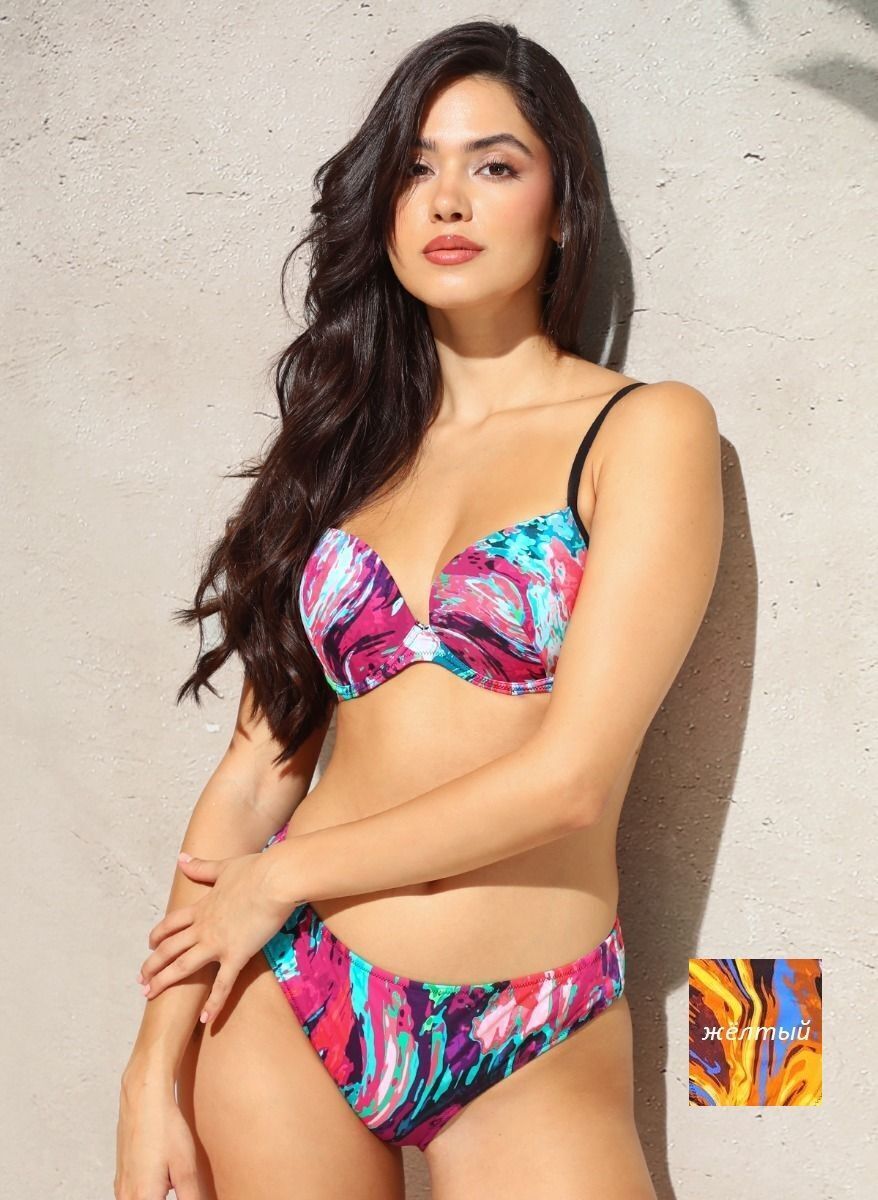 Раздельный комплект с формованным лифом обеспечивает комфортную поддержку и подчеркивает женственный силуэт. Яркий абстрактный принт в розовых тонах создаёт стильный акцент, превращая пляжный образ в произведение искусства.