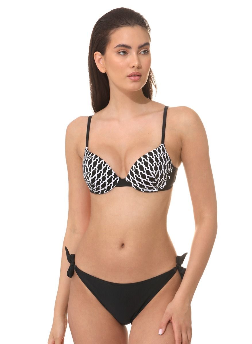 Раздельный купальник с эффектом пуш-ап создан для тех, кто ценит элегантность и уверенность в каждой детали. Геометрический узор и контрастная черно-белая гамма подчеркнут вашу индивидуальность у воды и на пляже.