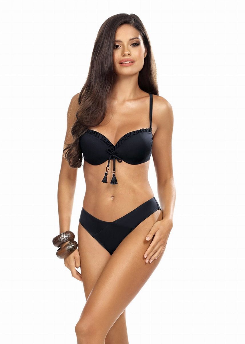 Черный раздельный купальник с формованными чашками и съемными пуш-ап вкладышами создает безупречный силуэт. Благодаря тонким регулируемым бретелям и элегантным кисточкам, модель сочетает комфорт и стиль.