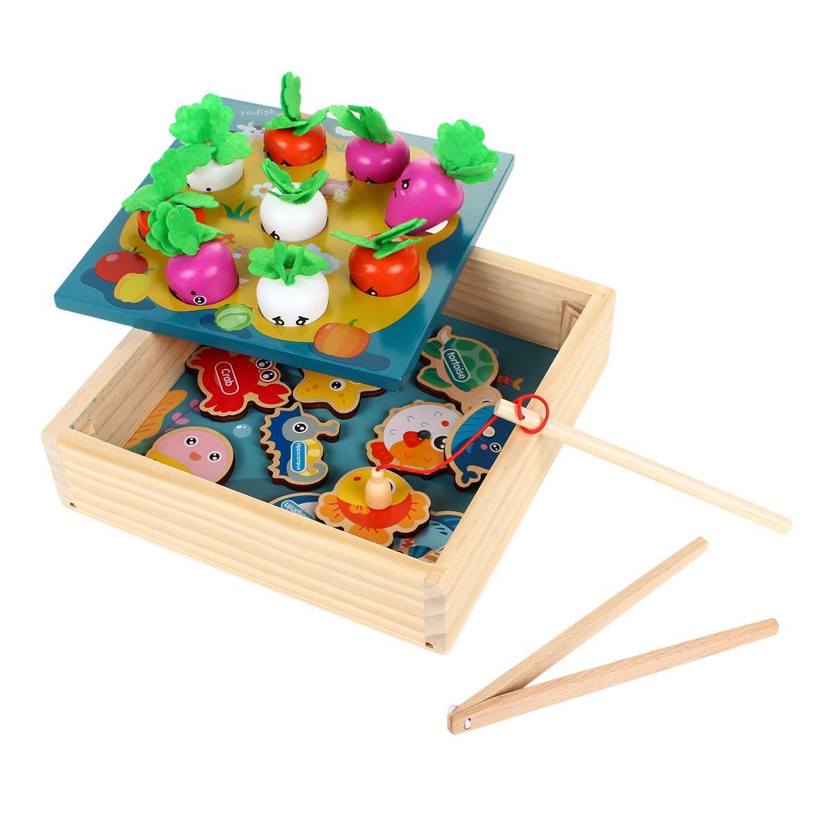Деревянный набор сочетает рыбалку и сортировку овощей, тренируя координацию движений и логическое мышление у детей от 15 месяцев. Яркие персонажи с добрыми мордочками превращают обучение в весёлую игру!