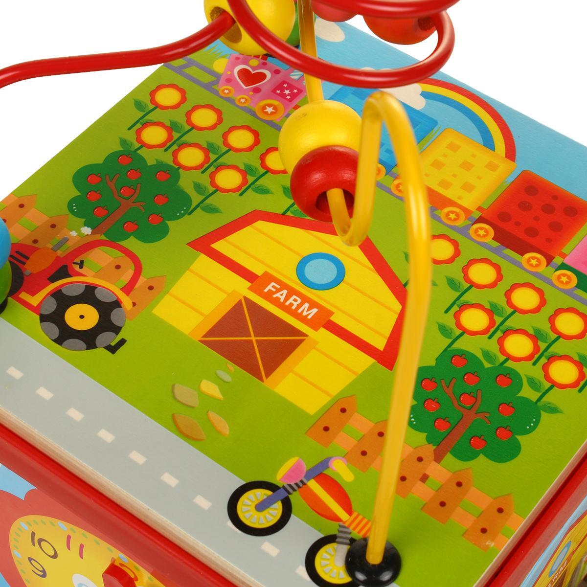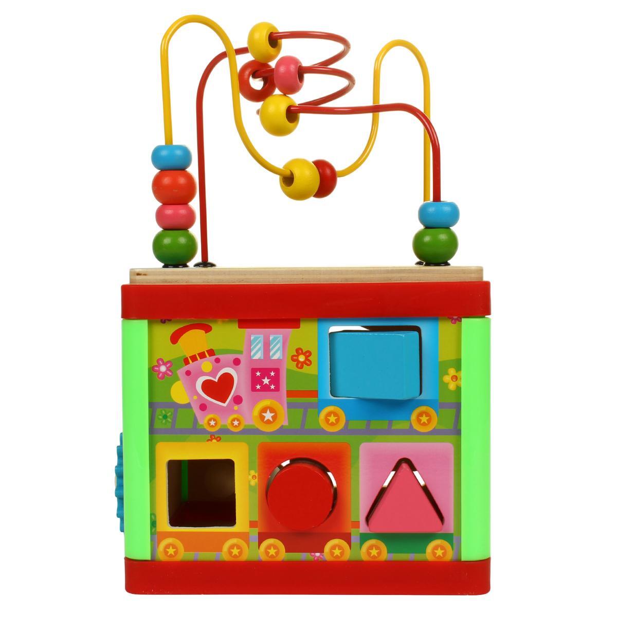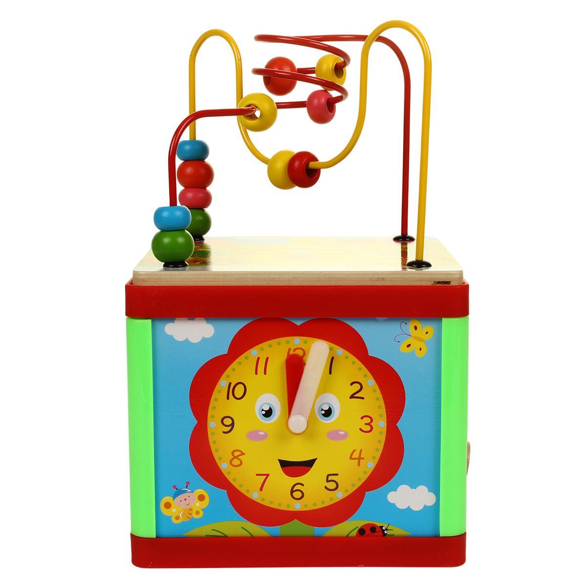Игрушка включает пять различных элементов: сортер с формами, часы с циферблатом, бусины на проволоке, вращающиеся шестеренки и фигурки для вставки. Каждый компонент разработан из безопасных, экологичных материалов, выполнен из прочного дерева с яркой окраской, устойчивой к износу. Размер 18x19x16 см позволяет удобно держать и играть, а удобная коробка обеспечивает легкую транспортировку и хранение.