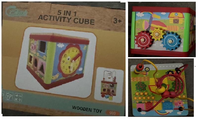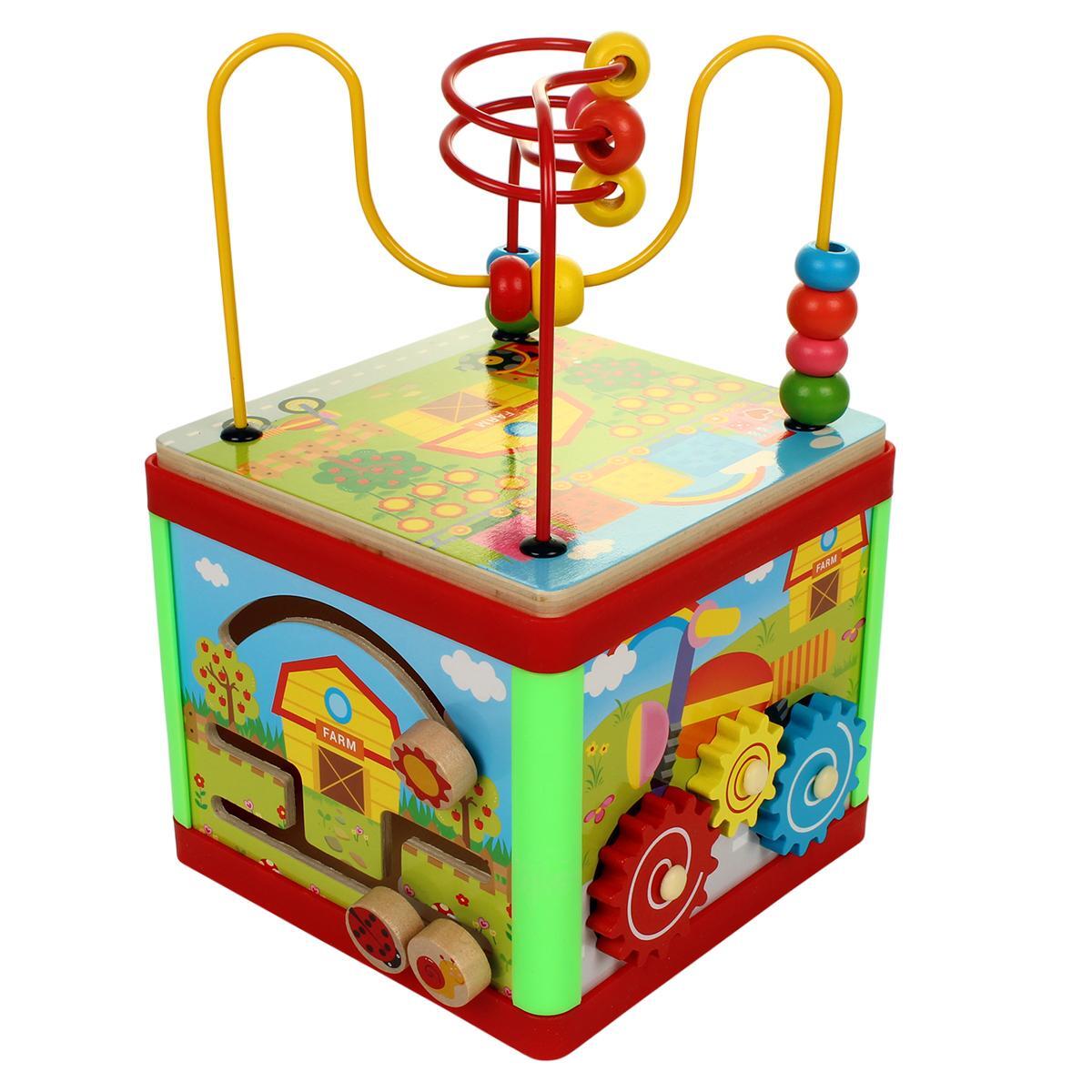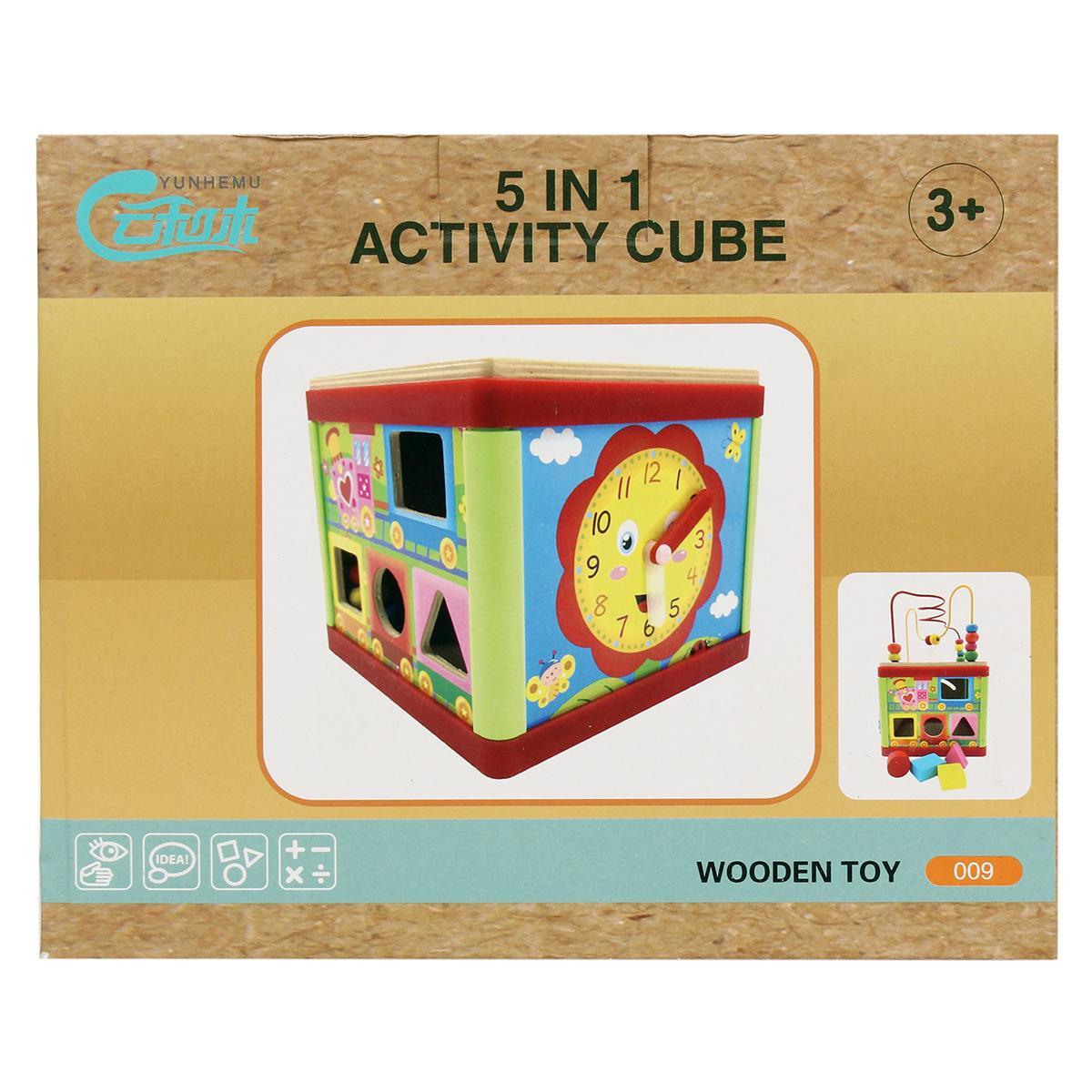 Игрушка включает пять различных элементов: сортер с формами, часы с циферблатом, бусины на проволоке, вращающиеся шестеренки и фигурки для вставки. Каждый компонент разработан из безопасных, экологичных материалов, выполнен из прочного дерева с яркой окраской, устойчивой к износу. Размер 18x19x16 см позволяет удобно держать и играть, а удобная коробка обеспечивает легкую транспортировку и хранение.