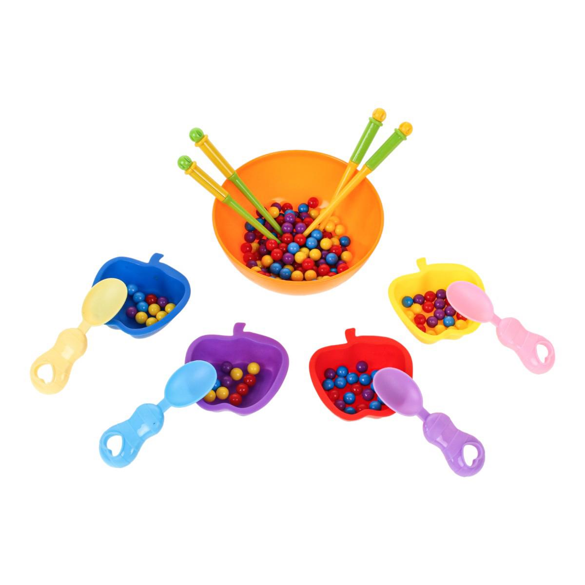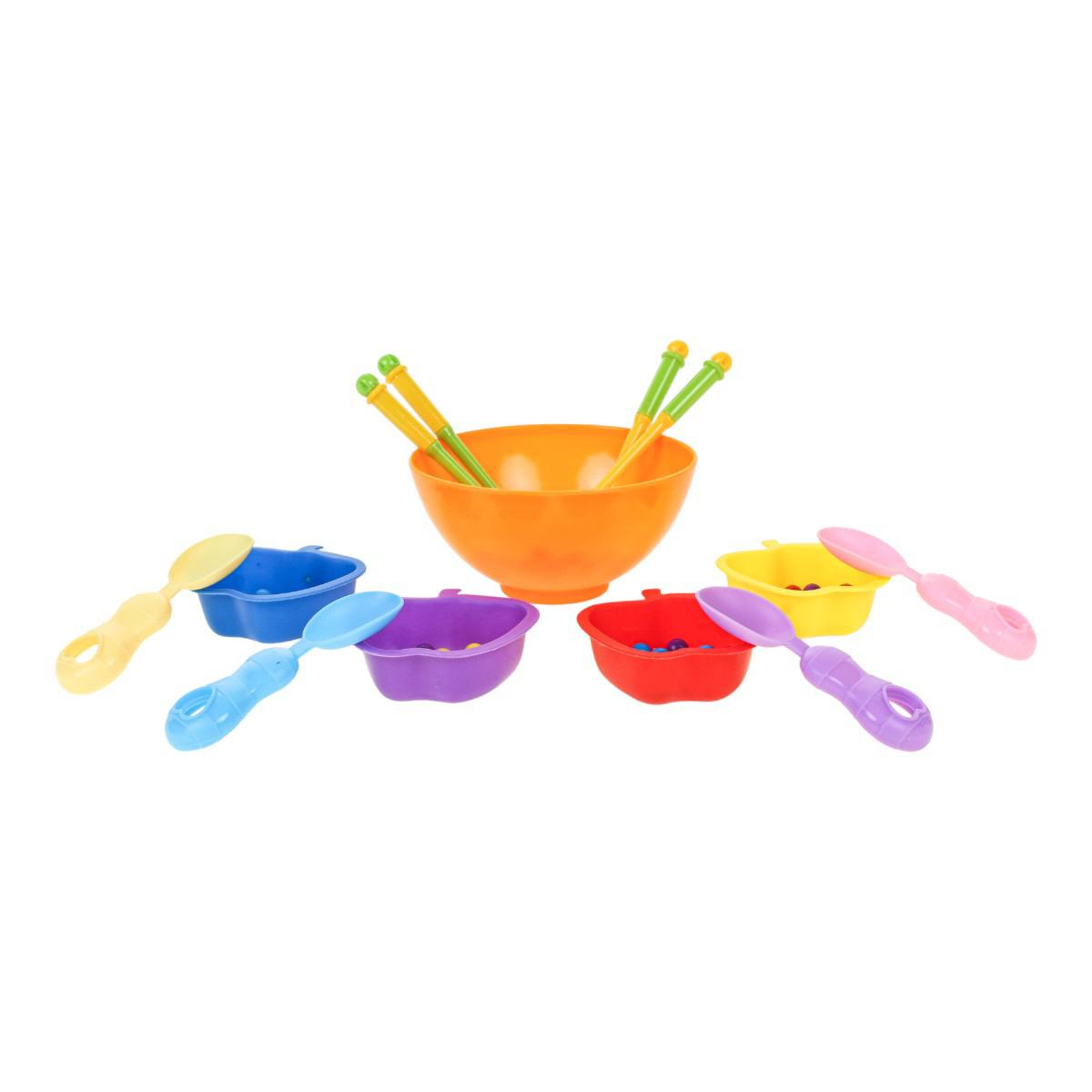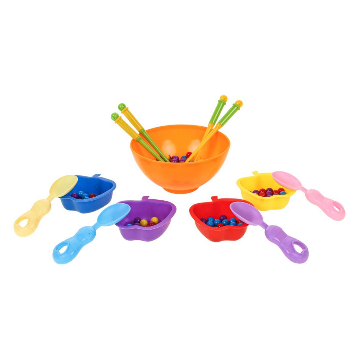 В набор входит большая центральная миска, маленькие миски для сортировки, ложки, палочки и разноцветные шарики. Элементы удобно держать в детских руках, что делает игру комфортной и безопасной при активном использовании. Сортер помогает совместить обучение и игру, превращая развитие навыков в естественный и увлекательный процесс.