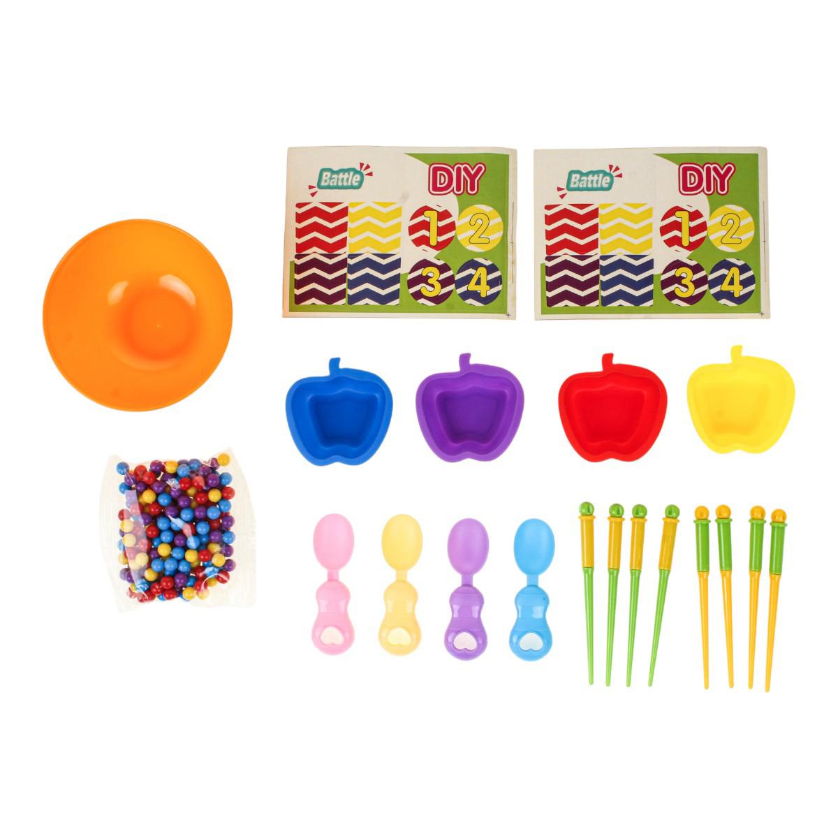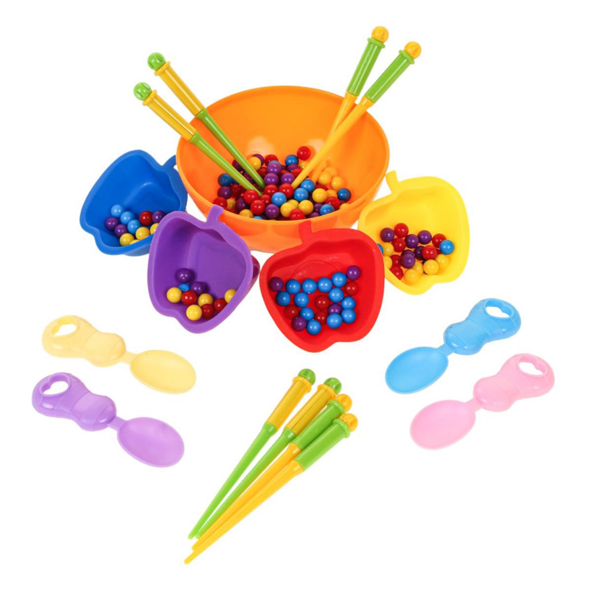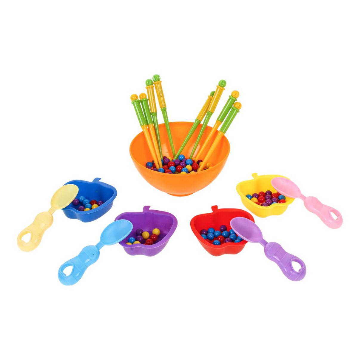 В набор входит большая центральная миска, маленькие миски для сортировки, ложки, палочки и разноцветные шарики. Элементы удобно держать в детских руках, что делает игру комфортной и безопасной при активном использовании. Сортер помогает совместить обучение и игру, превращая развитие навыков в естественный и увлекательный процесс.