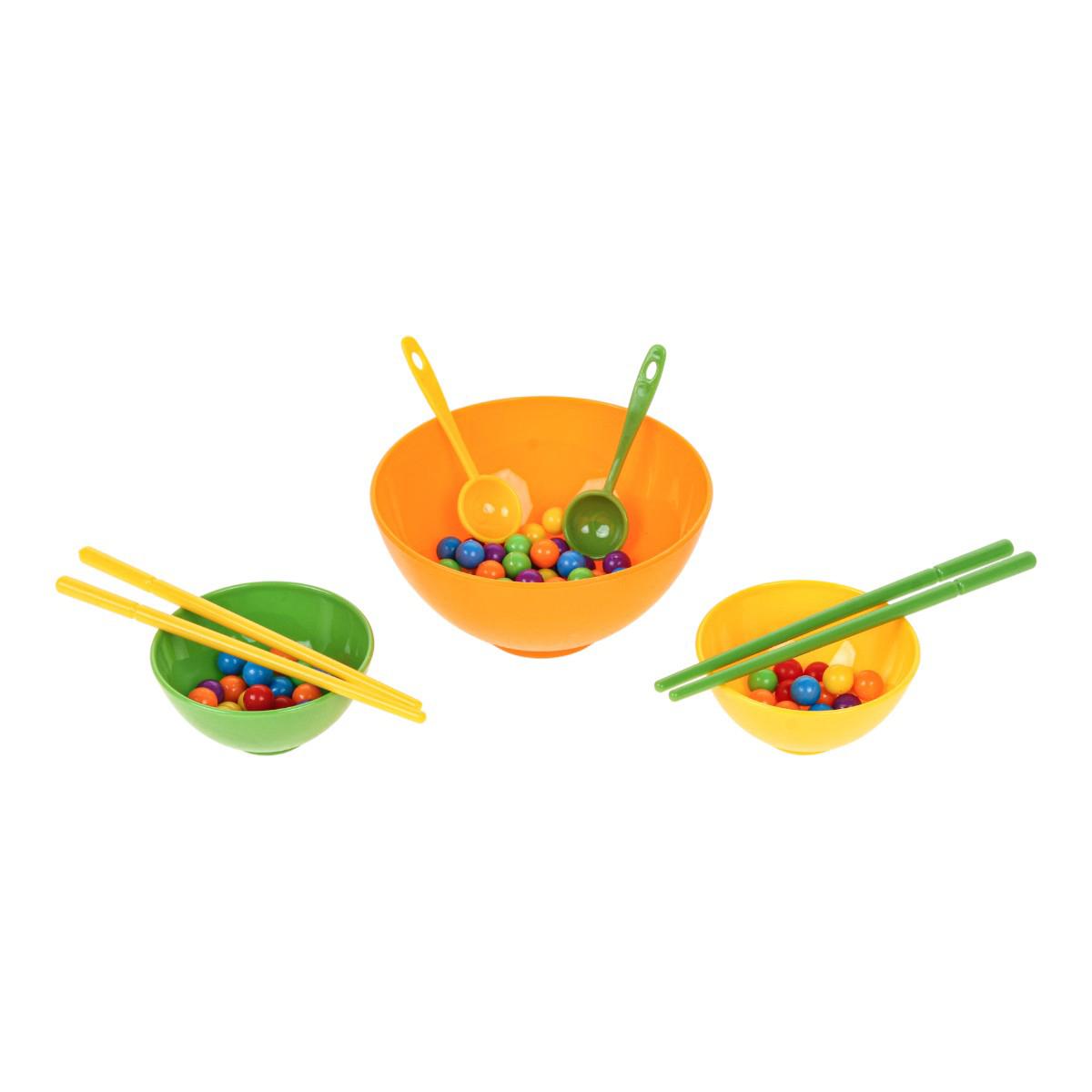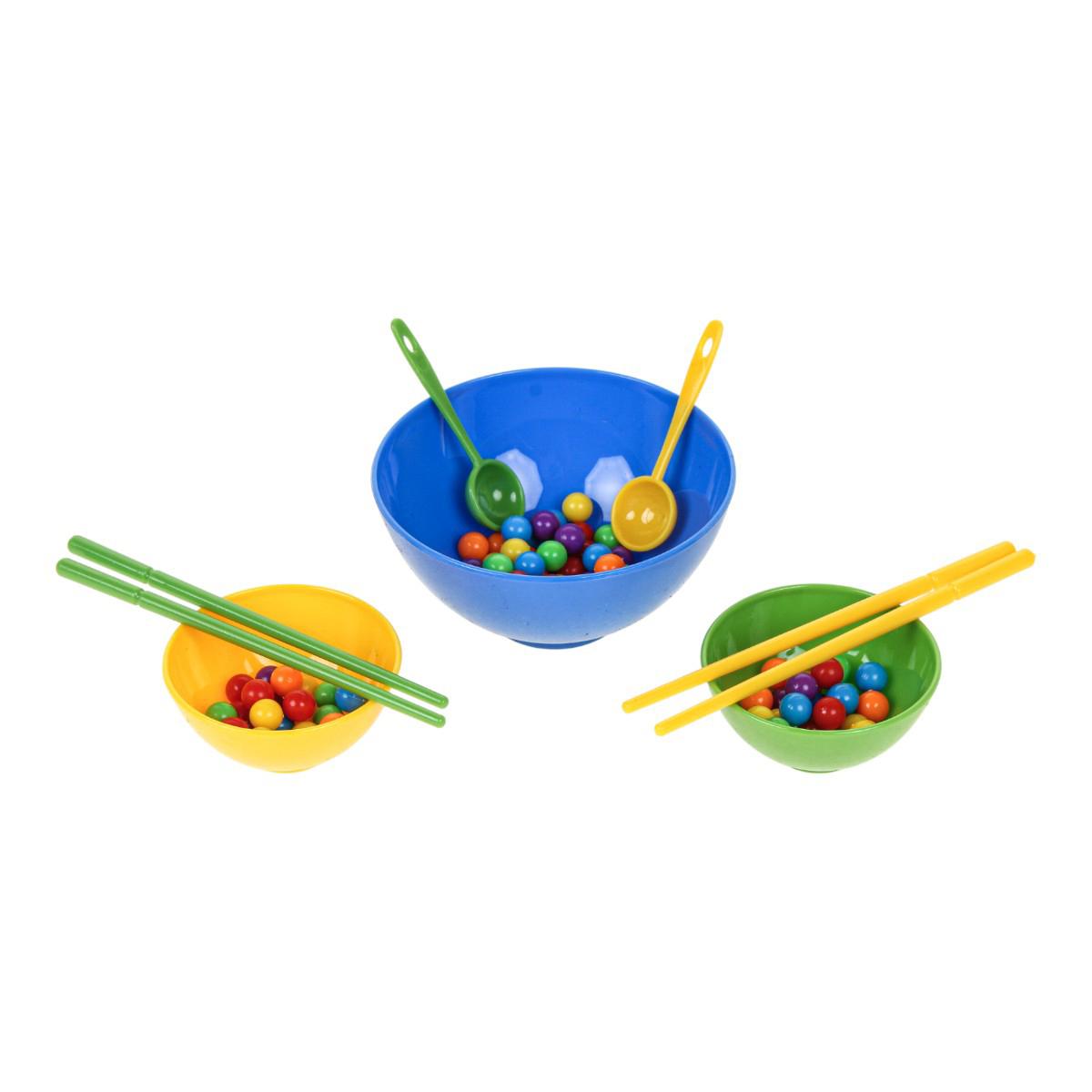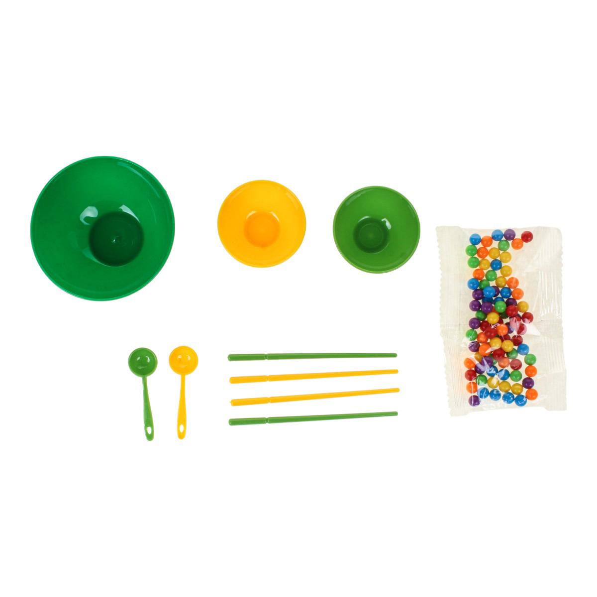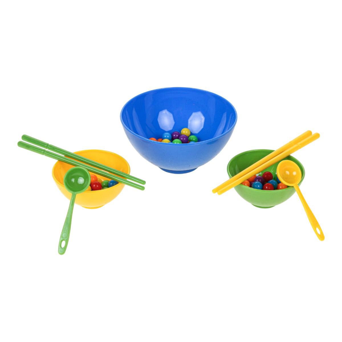 В набор входят миски разного размера, ложки, палочки и разноцветные шарики. Элементы выполнены из прочного пластика, рассчитаны на активное использование. Игра компактная, ее удобно хранить и брать с собой в поездку.
