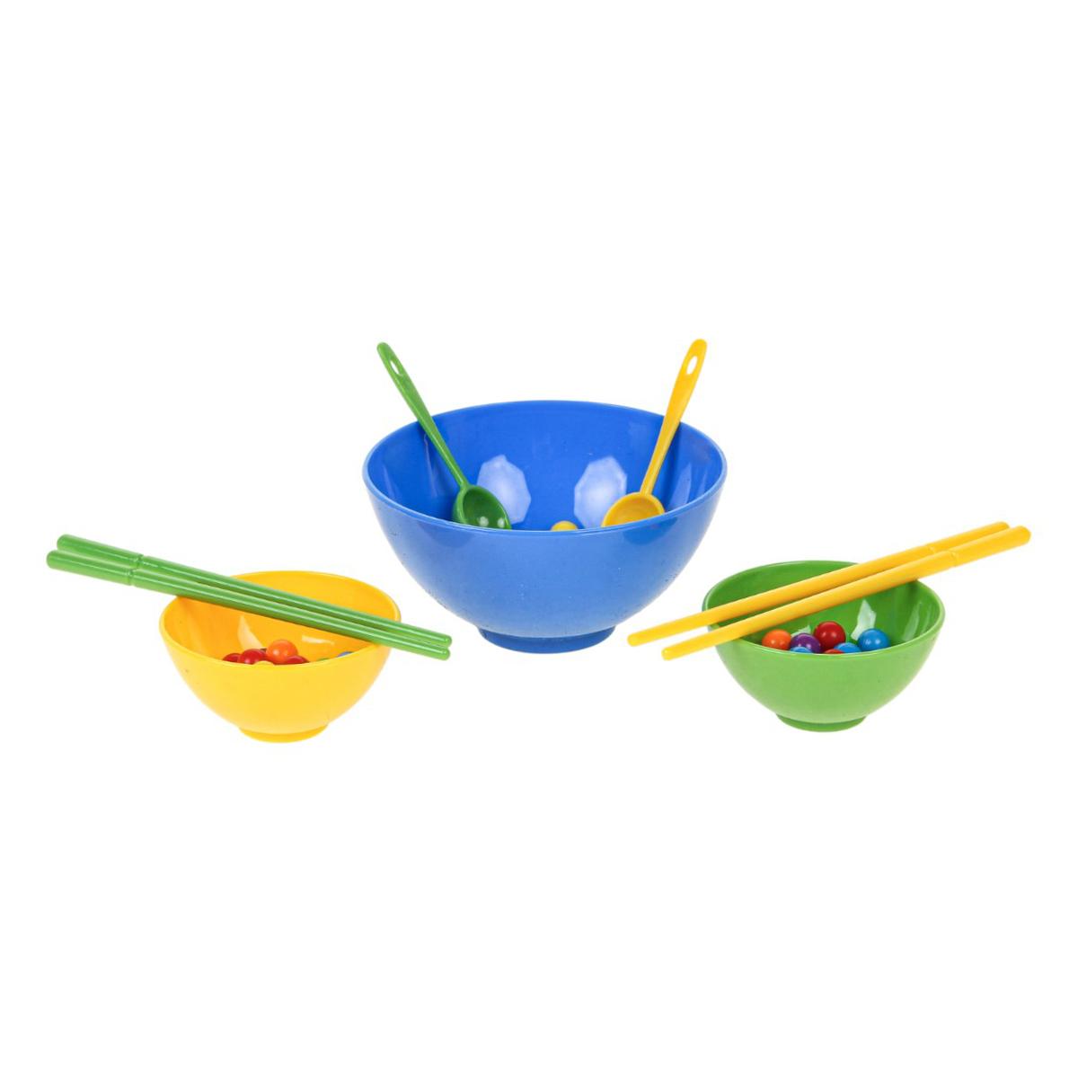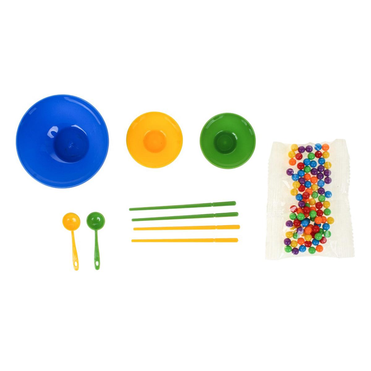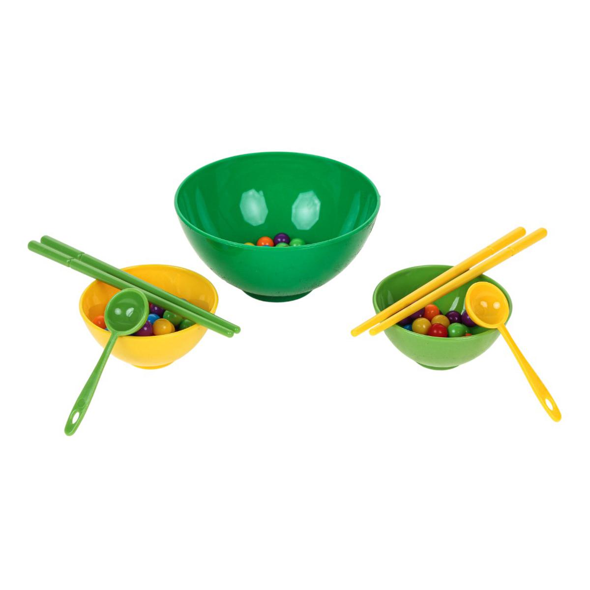 В набор входят миски разного размера, ложки, палочки и разноцветные шарики. Элементы выполнены из прочного пластика, рассчитаны на активное использование. Игра компактная, ее удобно хранить и брать с собой в поездку.