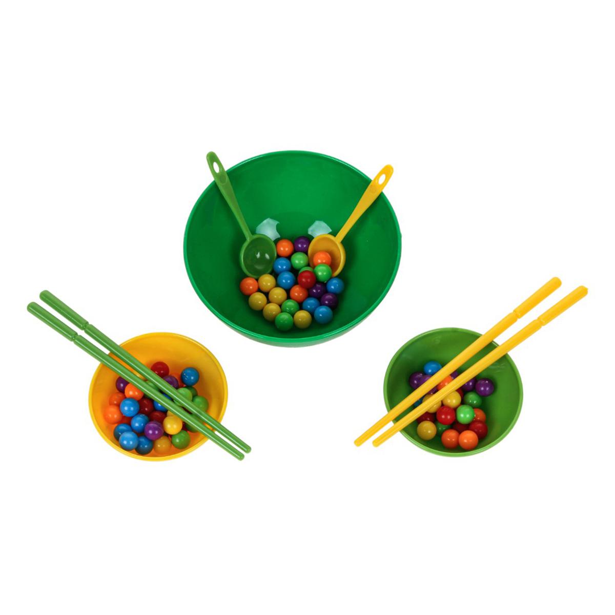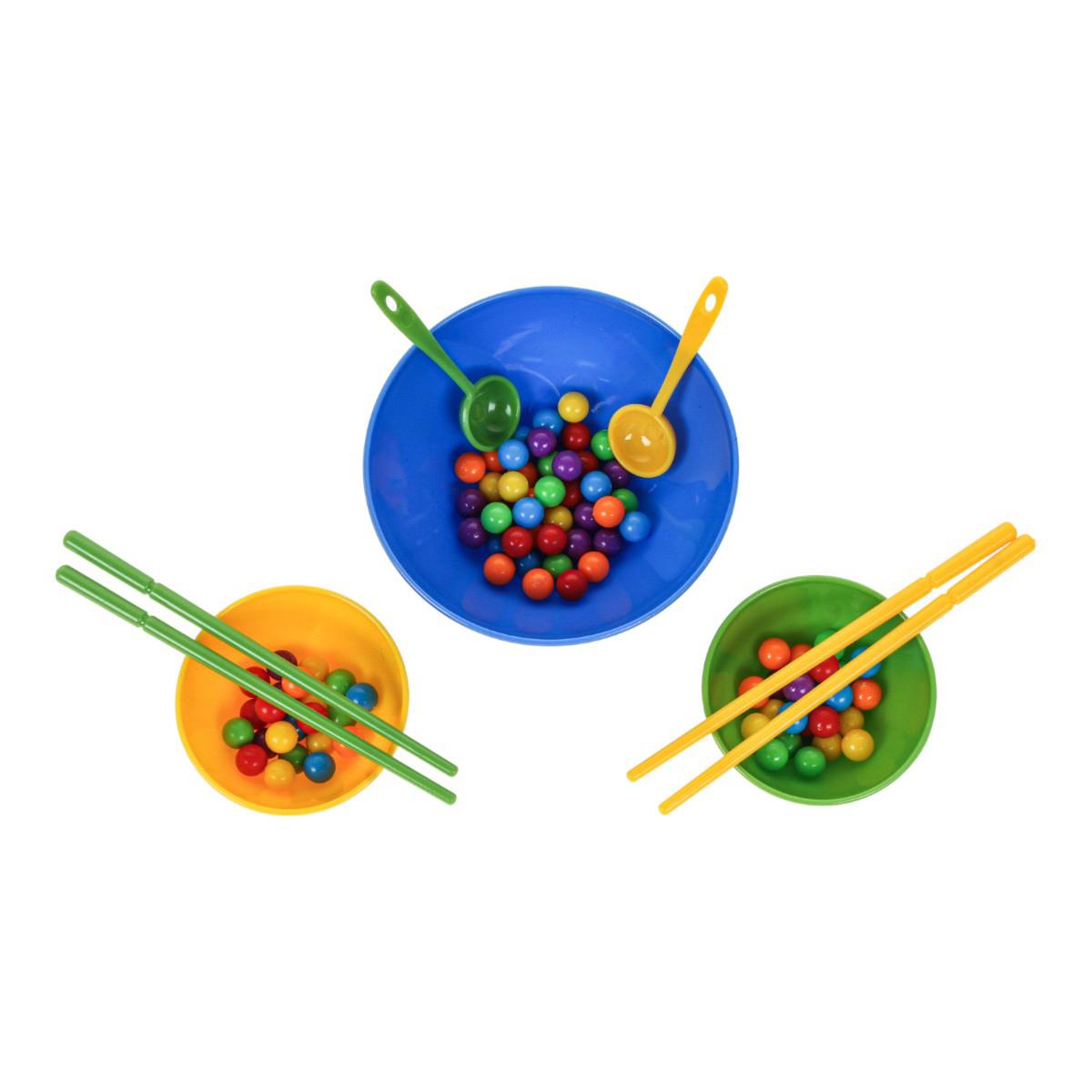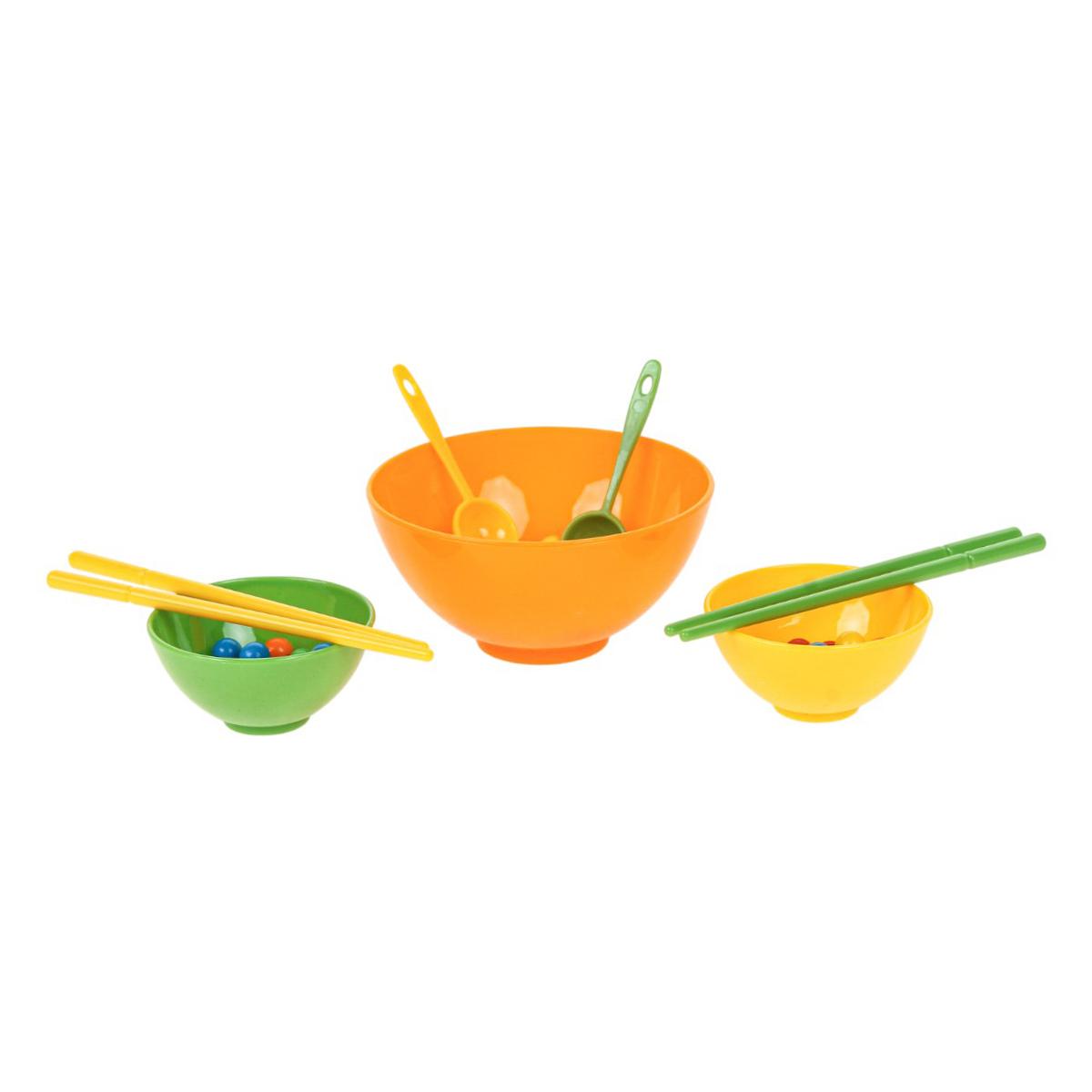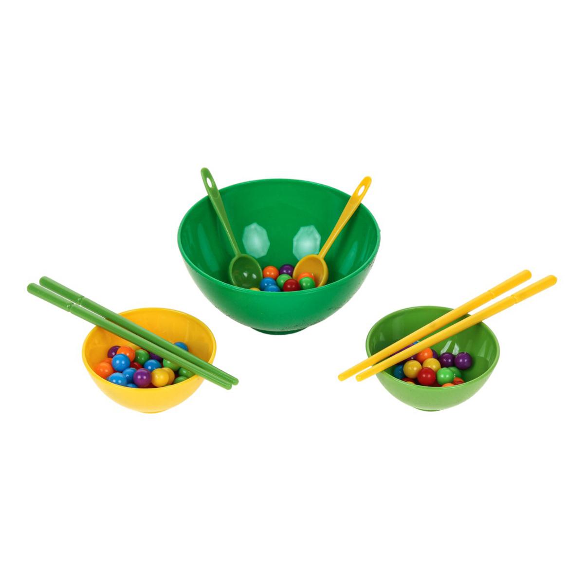 В набор входят миски разного размера, ложки, палочки и разноцветные шарики. Элементы выполнены из прочного пластика, рассчитаны на активное использование. Игра компактная, ее удобно хранить и брать с собой в поездку.