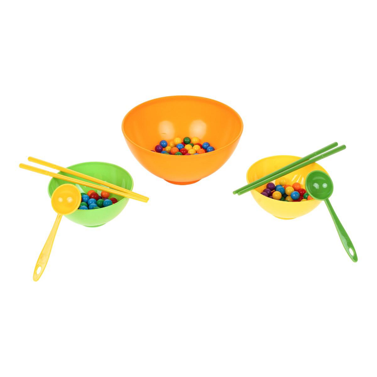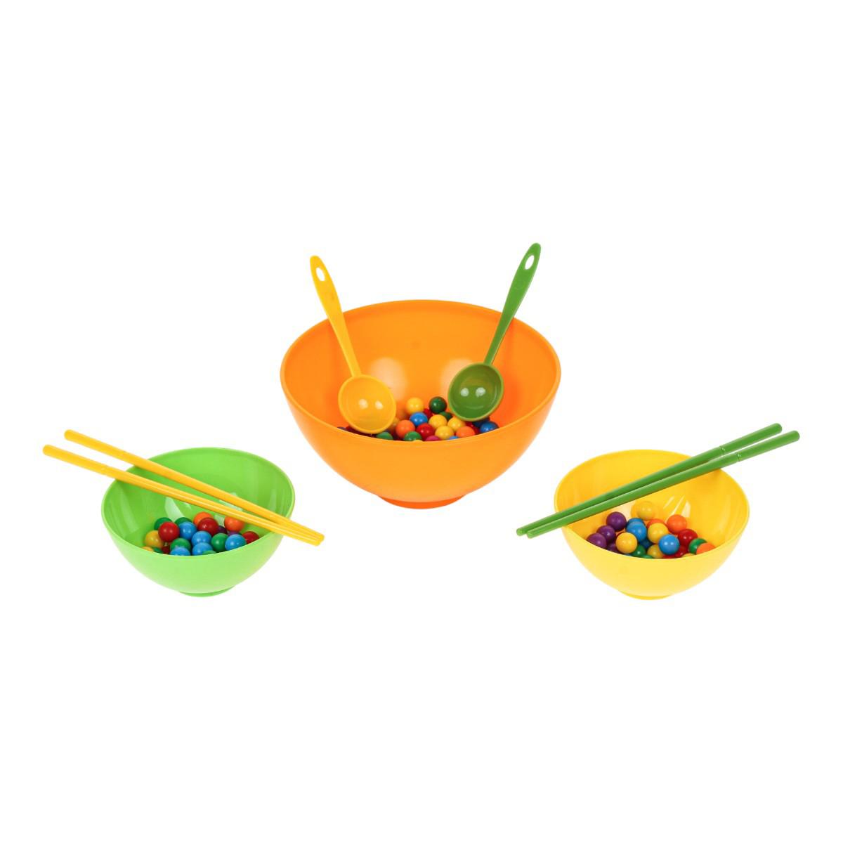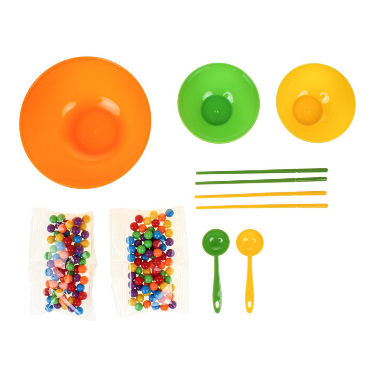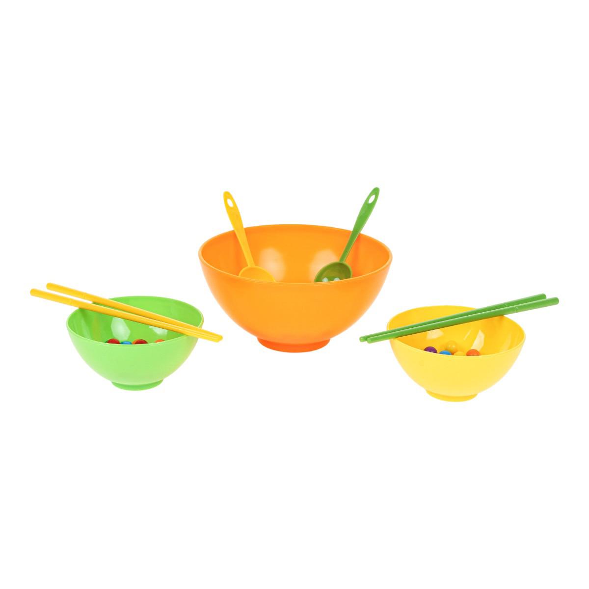 В набор входят миски разного размера, ложки, палочки и разноцветные шарики. Элементы выполнены из пластика и рассчитаны на многократное использование. Размер упаковки — 16x6x16,5 см, компактный формат mini size.