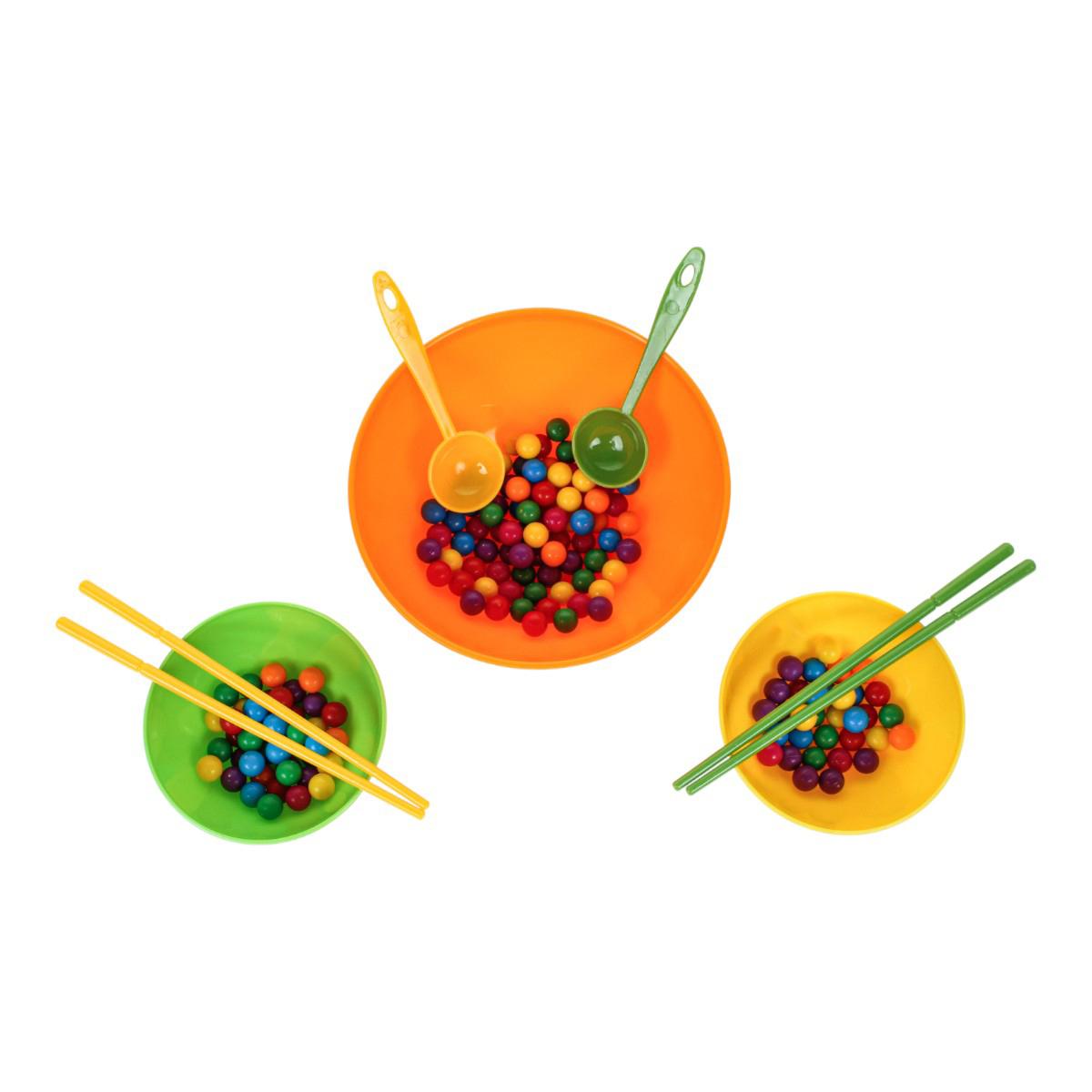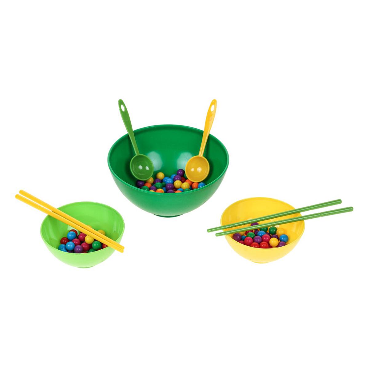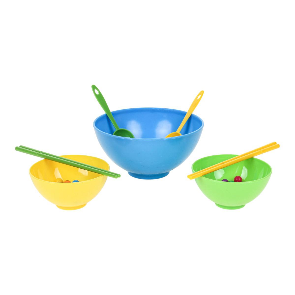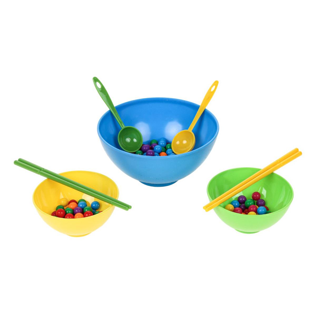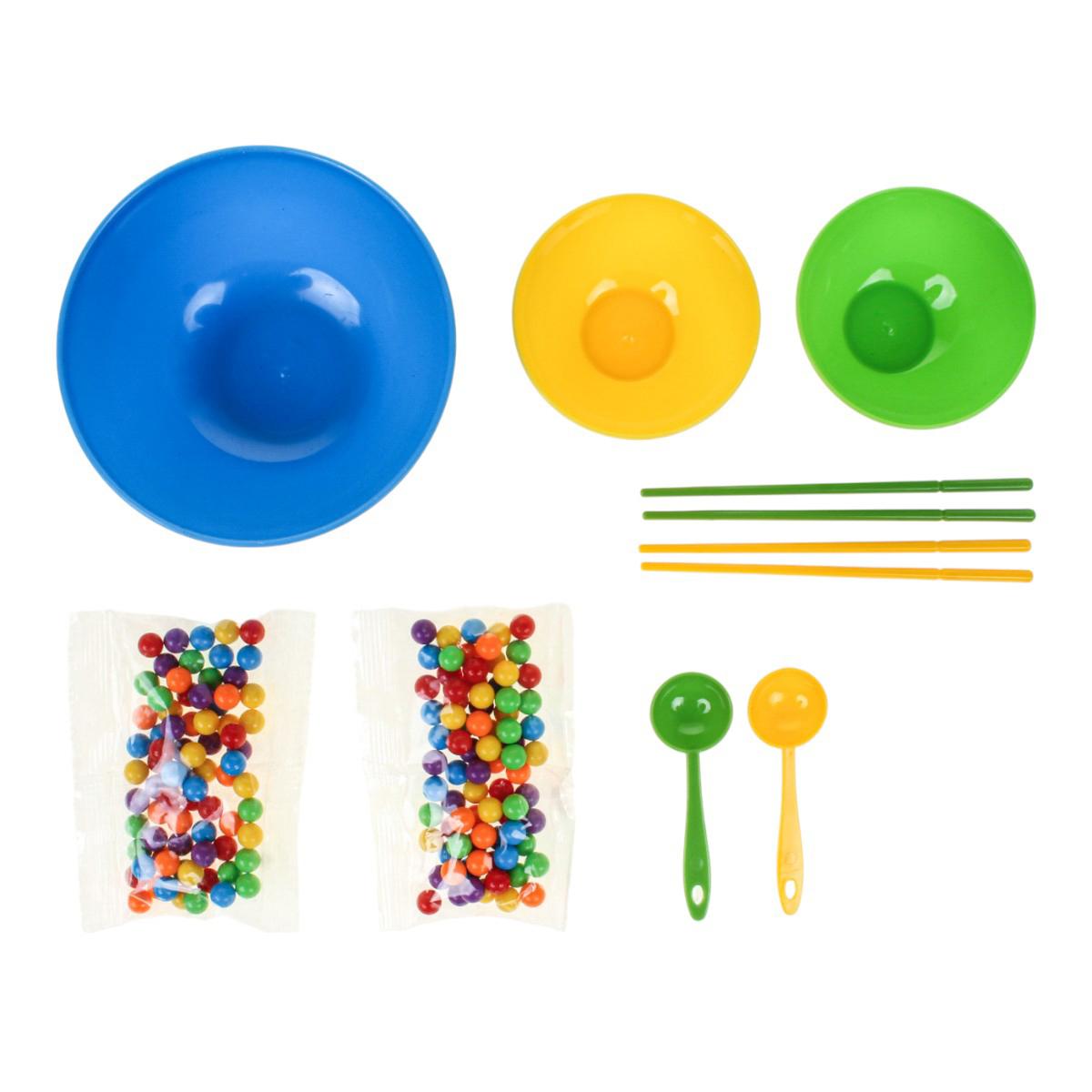 В набор входят миски разного размера, ложки, палочки и разноцветные шарики. Элементы выполнены из пластика и рассчитаны на многократное использование. Размер упаковки — 16x6x16,5 см, компактный формат mini size.