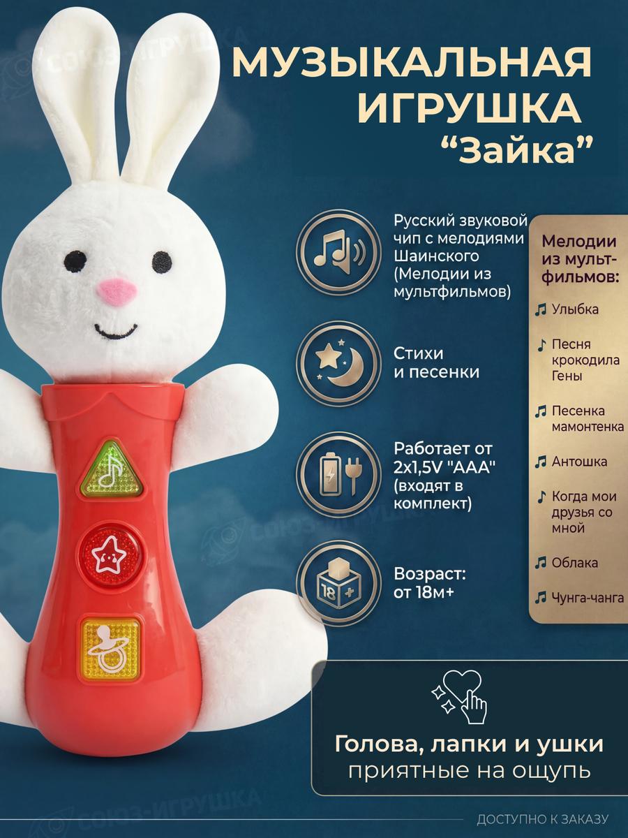 Игрушка оснащена русским звуковым чипом, который воспроизводит 4 песенки и 6 стихов, а также 7 мелодий из любимых мультфильмов. С помощью трех кнопок, расположенных на игрушке, ваш ребенок сможет легко переключать мелодии и стихи, что делает игру интерактивной и интересной. 'Зайка' идеально подходит для детей от 18 месяцев и станет отличным подарком для любого малыша.