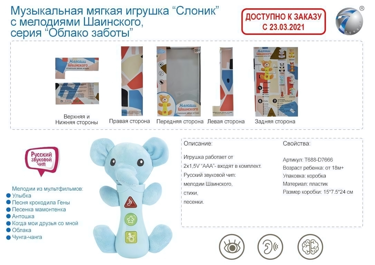 Мягкий слоник с мелодиями из любимых мультфильмов превратит развитие в увлекательную игру! Светящиеся кнопки и 7 знакомых мелодий стимулируют слуховое восприятие и тактильные навыки у детей от 1.5 лет.