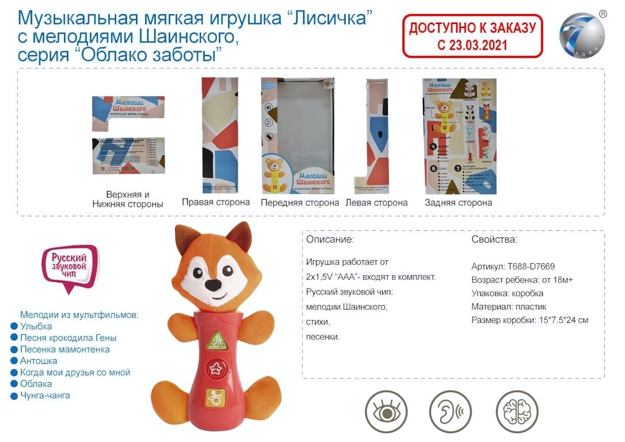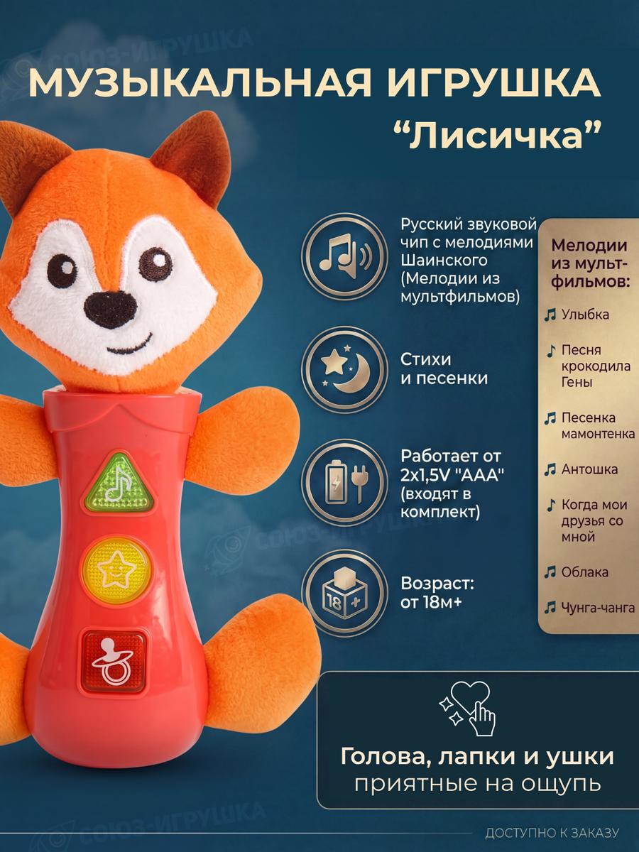 Яркая интерактивная лисичка с мелодиями из любимых мультфильмов превратит знакомство с миром в увлекательную игру. Мягкие текстильные элементы и продуманная конструкция безопасны для малышей от 1.5 лет.