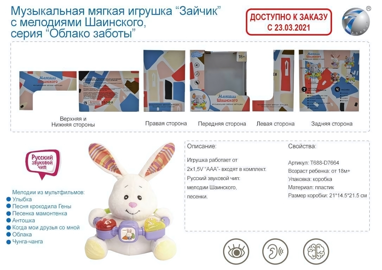 Эта мягкая развивающая игрушка в виде зайчика способствует развитию мелкой моторики, слуха и внимания у малышей с 18 месяцев. Игрушка оснащена яркими световыми и звуковыми эффектами, которые привлекают внимание и стимулируют активное участие ребенка. Воспроизводит 4 песни и 7 мелодий из мультфильмов, что делает игру интересной и познавательной.