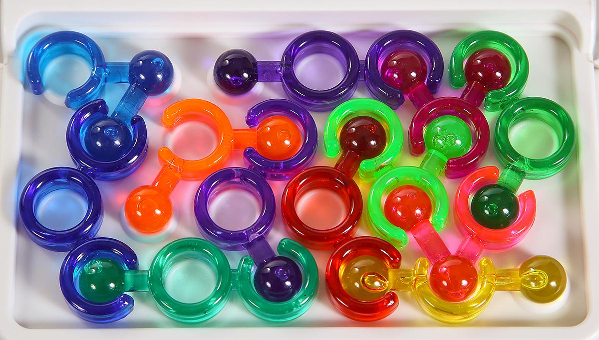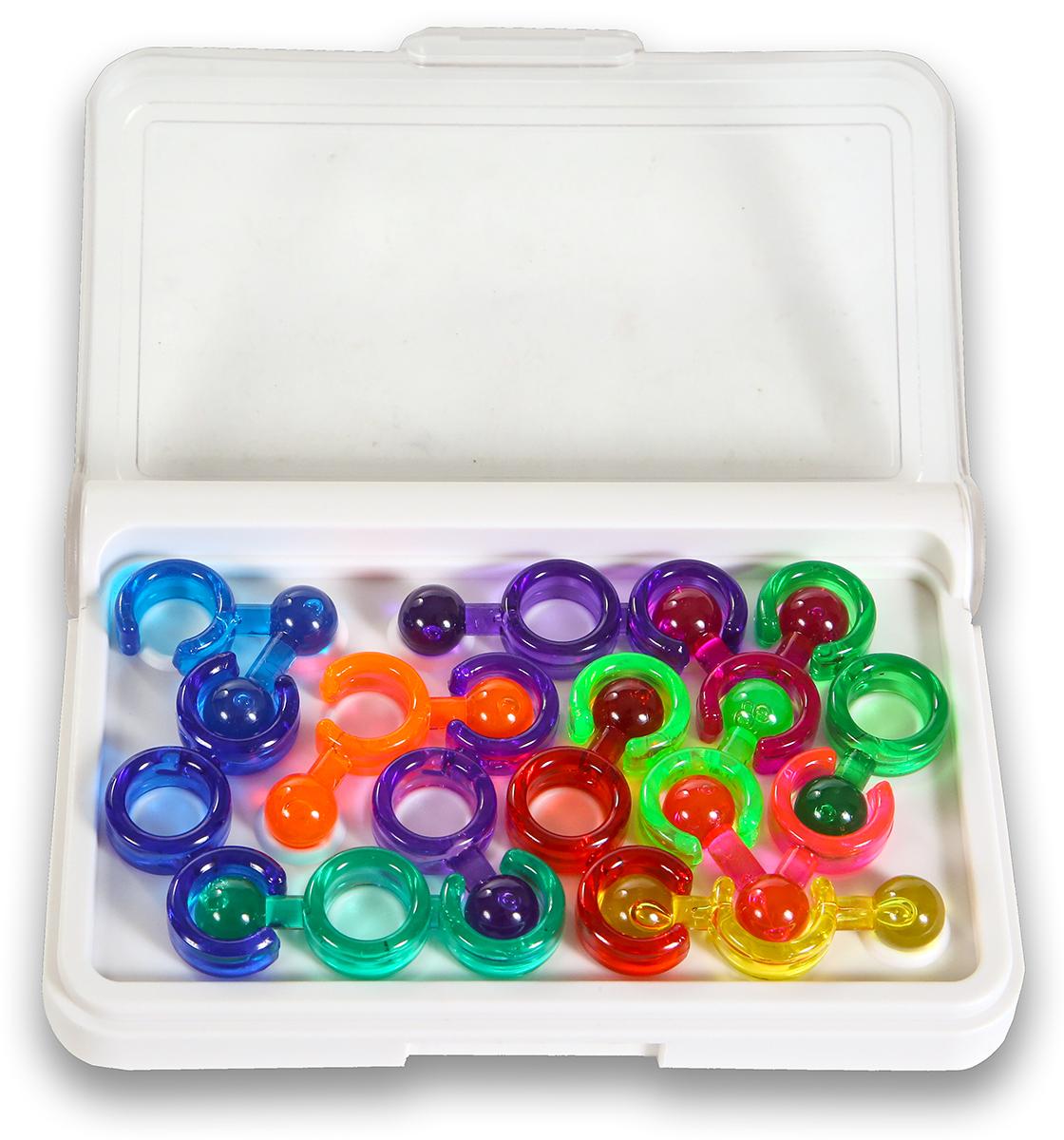 Игровые элементы изготовлены из прочного пластика различных цветов: синего, красного, зеленого, желтого и фиолетового. Размер упаковки составляет 9,8х3х14,5 см, что делает ее удобной для хранения и транспортировки.