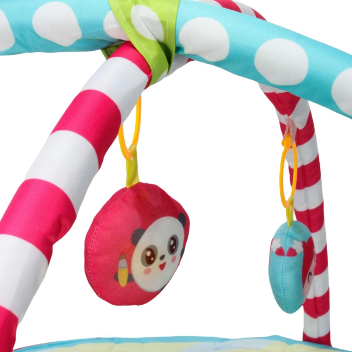 Коврик 85х85 см из гипоаллергенного текстижа легко чистится влажной салфеткой. Прочные пластиковые дуги выдерживают вес подвесных элементов. В сложенном виде помещается в компактную сумку-переноску — идеально для поездок и визитов к бабушке.