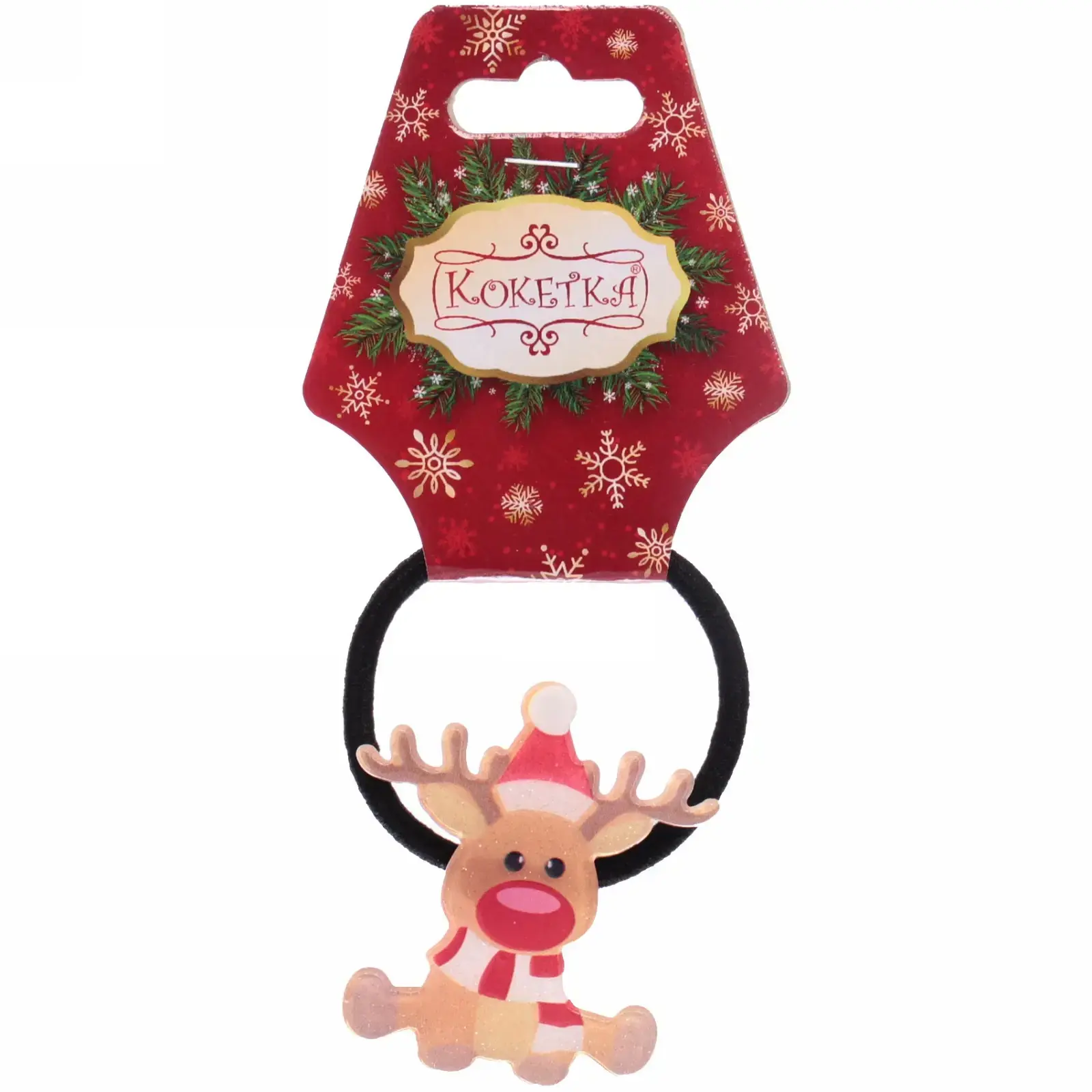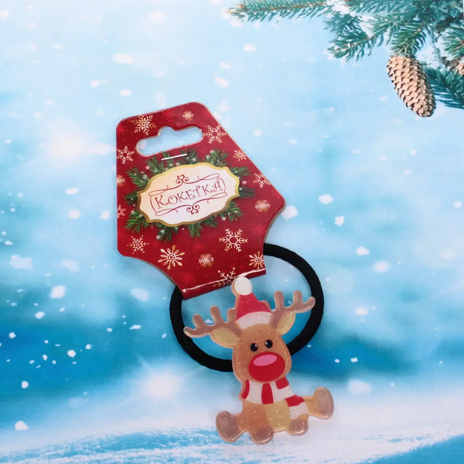 Размер резинки составляет 5 см в диаметре, что делает ее удобной для использования. Декоративный элемент в виде оленя выполнен в светло-коричневом цвете с красным носом и шапочкой, что придает аксессуару праздничный вид. Упаковка оформлена в красном цвете с белыми снежинками, что подчеркивает новогоднюю тематику. Резинка станет отличным подарком для друзей и близких в праздничный сезон.