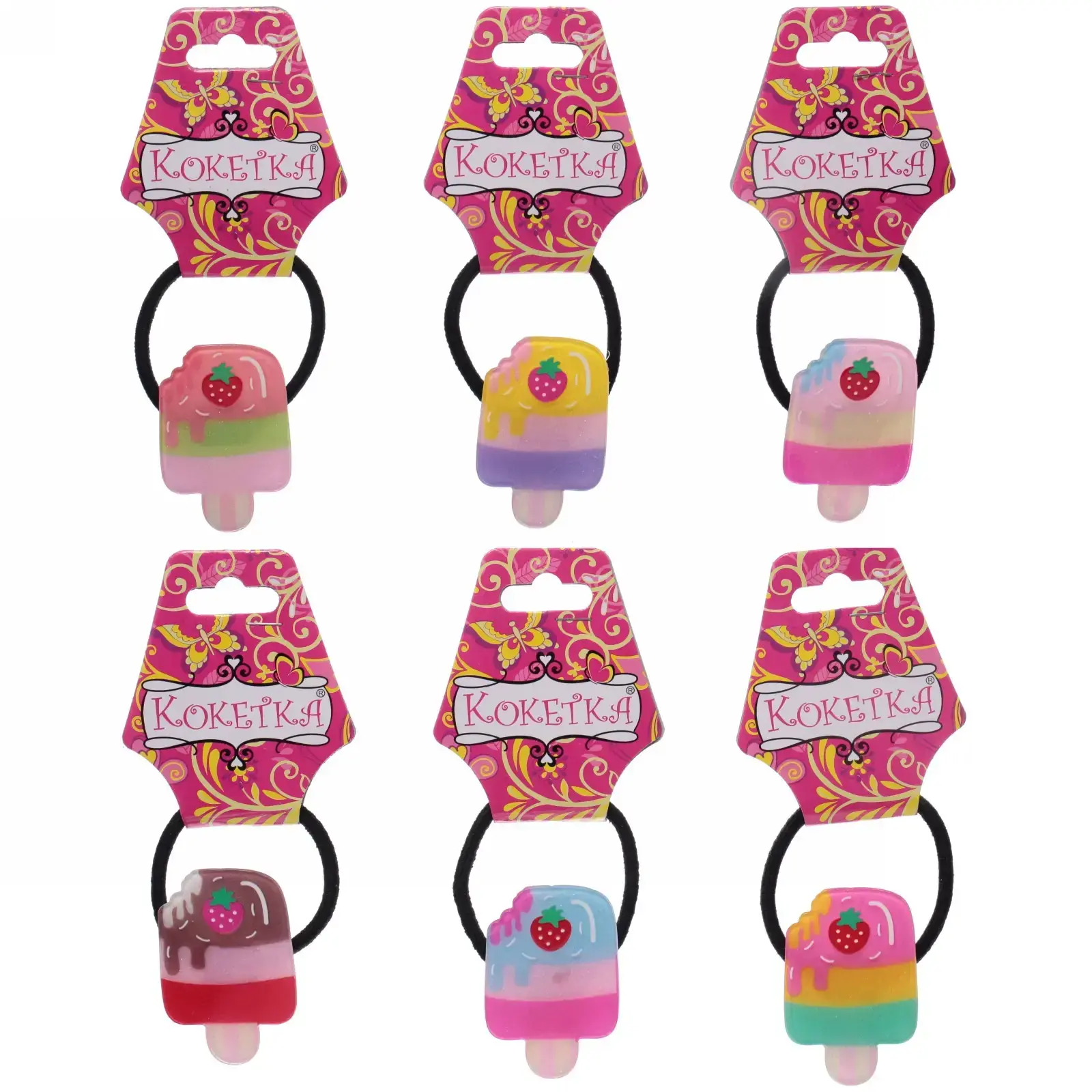 Резинка имеет диаметр 4 см и представлена в миксе из 6 ярких цветов: розового, фиолетового, зеленого, желтого и красного. Декоративный элемент в виде мороженого добавляет игривости и оригинальности. Изготовлена из пластика и текстиля, что делает её легкой и приятной на ощупь.