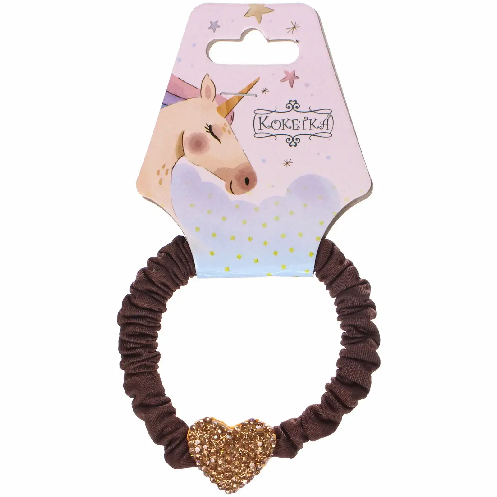 Размер резинки составляет 5,5 см в диаметре, что делает ее универсальной для большинства причесок. Коричневый цвет легко сочетается с различными оттенками волос и одеждой, а золотое сердце, украшенное стразами, добавляет нотку роскоши. Упаковка оформлена в пастельных тонах с изображением единорога, что делает ее отличным вариантом для подарка.