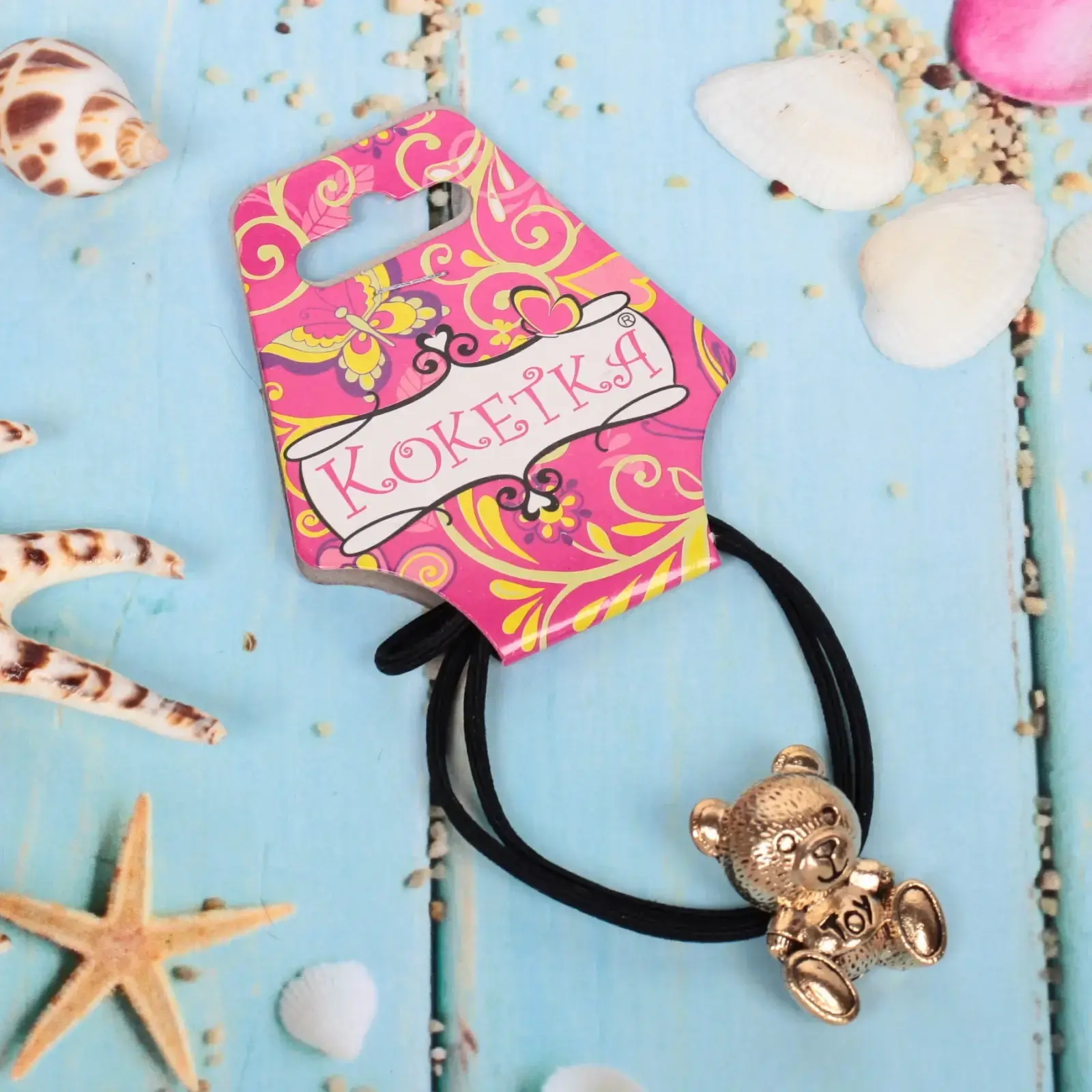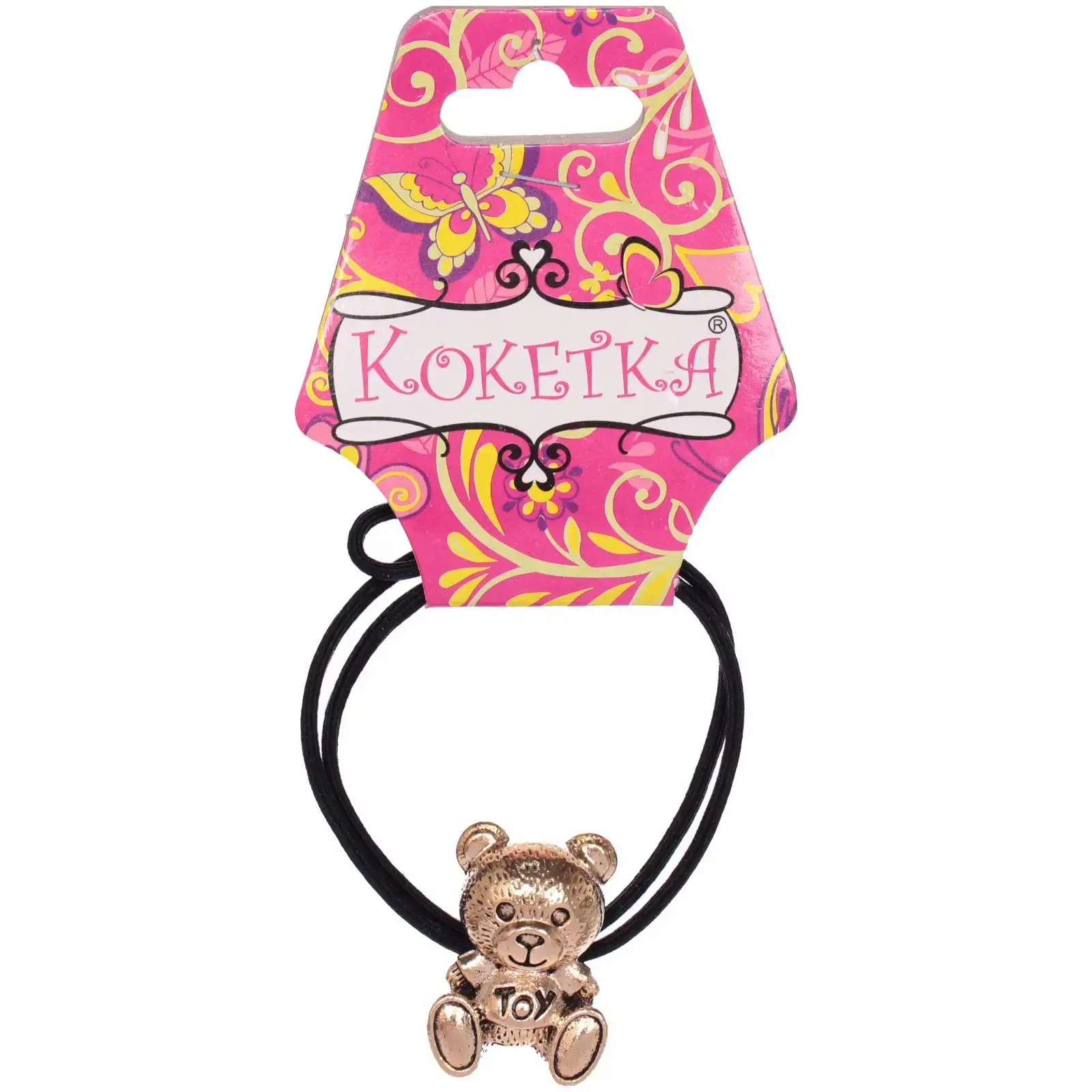 Размер резинки составляет 5 см в диаметре, что делает ее удобной для использования. Декор в виде медвежонка выполнен в золотистом цвете, что придает аксессуару особый шарм. Упаковка оформлена в ярком дизайне с цветочными узорами и бабочками, что делает ее отличным подарком для близких и друзей.