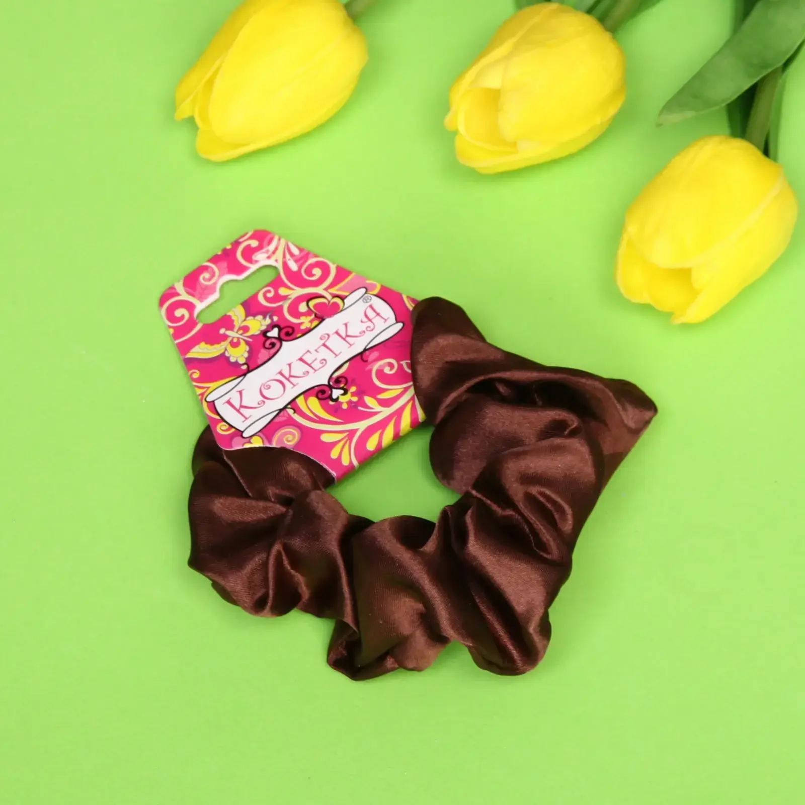 Размер резинки составляет 10,5 см в диаметре, что делает её удобной для использования. Гладкая и блестящая текстура придаёт ей стильный вид, а качественный материал обеспечивает долговечность. Упаковка с ярким дизайном и цветочным узором делает этот аксессуар отличным подарком для близких.