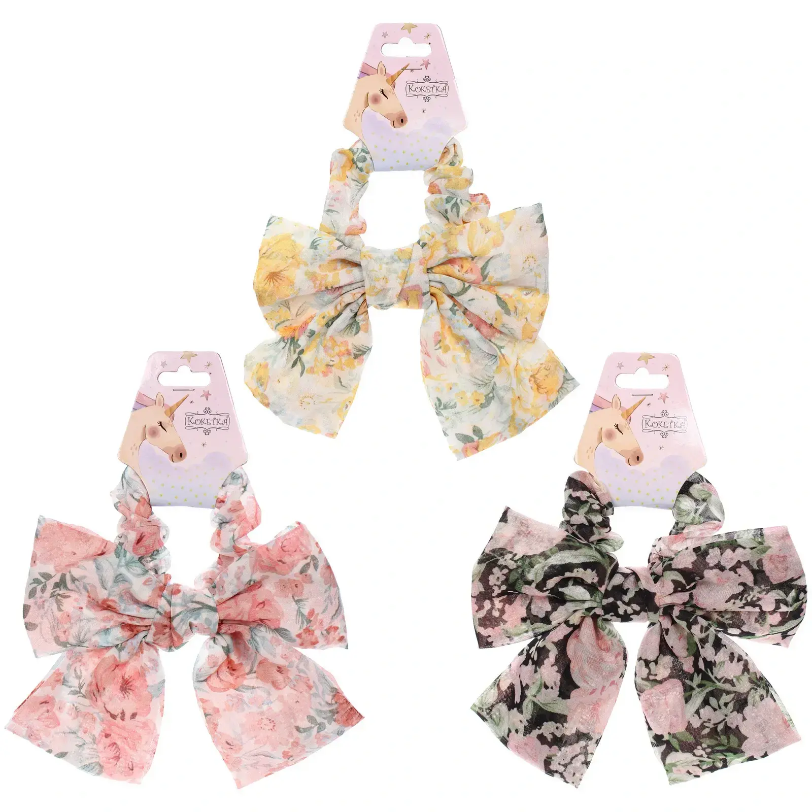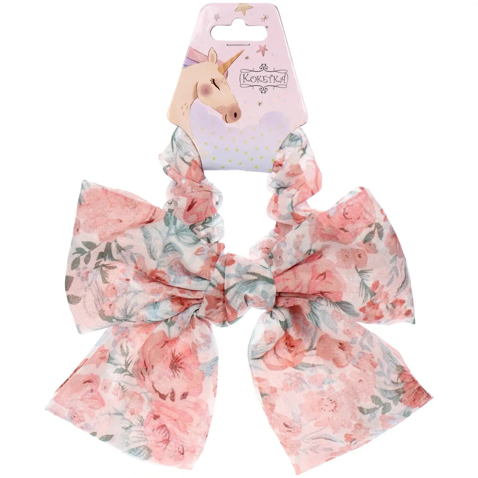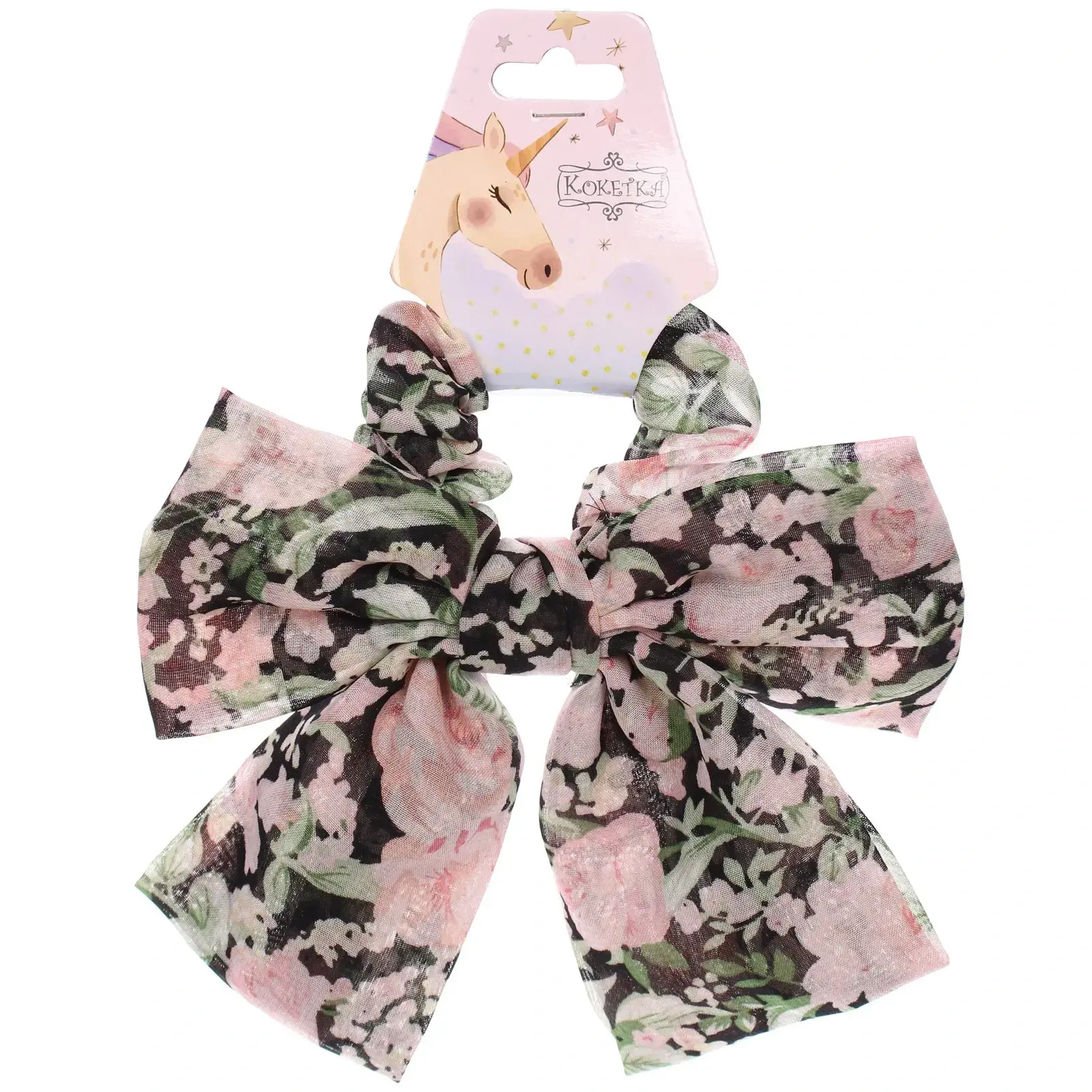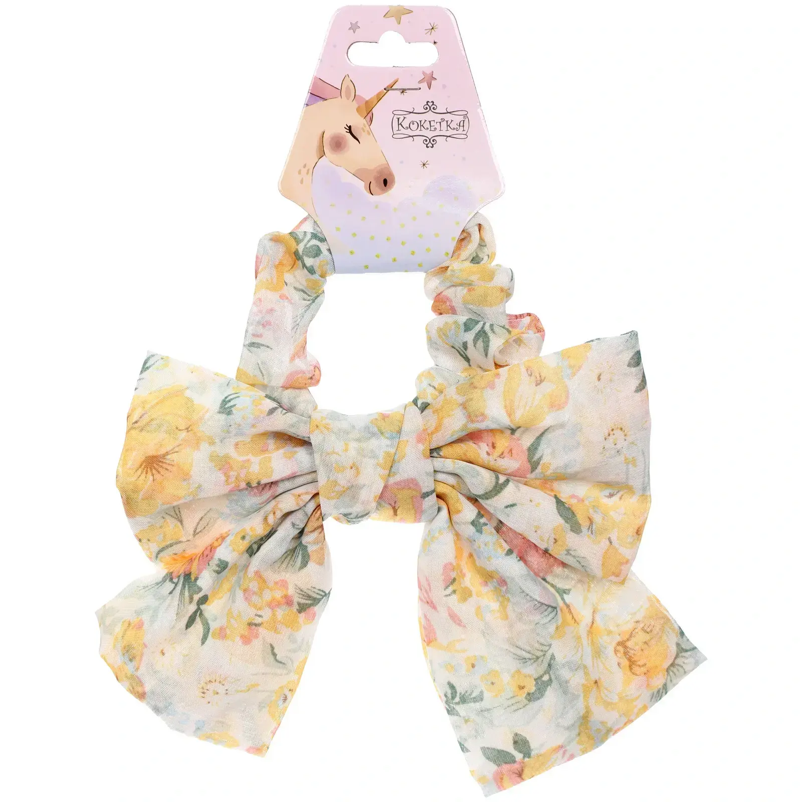 Размер резинки составляет 8,5 см в диаметре, что делает ее заметным аксессуаром. Она выполнена из текстиля, что обеспечивает долговечность и комфорт. Резинка украшена цветочным принтом, который добавляет игривости и свежести в ваш образ. Упаковка с изображением единорога делает этот товар отличным подарком для девочек и женщин, которые ценят стиль и качество.