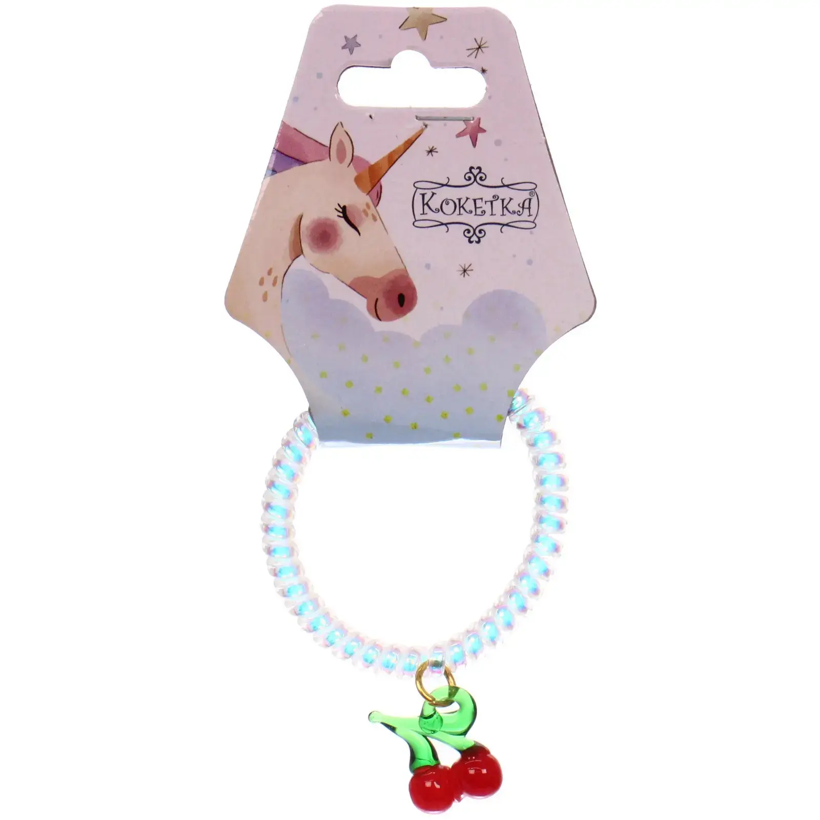 Резинка имеет диаметр 5,5 см и выполнена в белом цвете, что делает ее универсальной для сочетания с различными нарядами. Подвеска в виде вишен выполнена из качественного пластика и добавляет яркие акценты. Упаковка оформлена в нежных пастельных тонах с изображением единорога, что делает ее отличным подарком для друзей и близких.