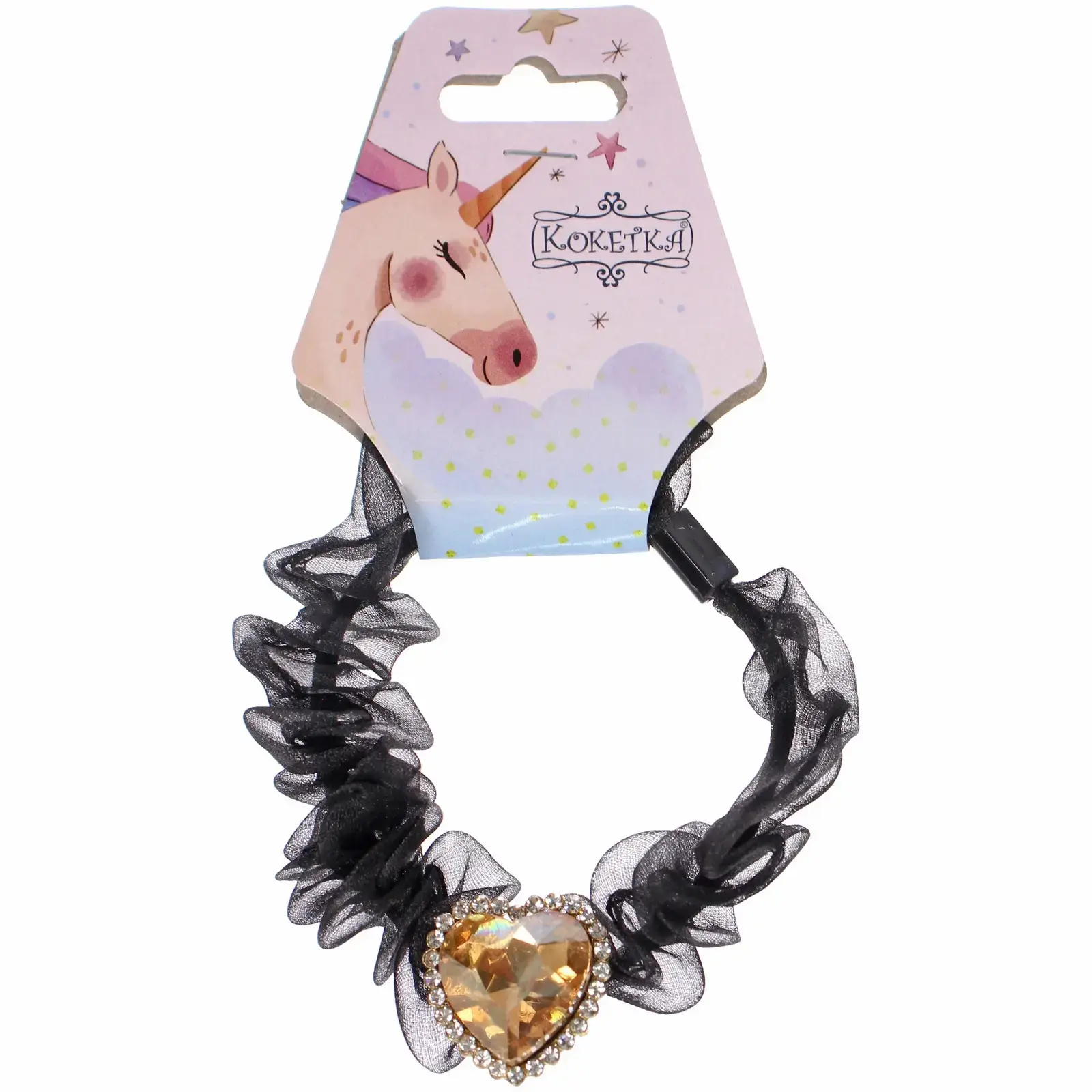 Резинка выполнена из черной прозрачной ткани, собранной в рюшку, и имеет диаметр 5,5 см. Декоративный элемент в центре резинки добавляет блеска и стиля. Упаковка оформлена в пастельных тонах с изображением единорога, что делает её отличным вариантом для подарка. Не упустите возможность добавить этот стильный аксессуар в свою коллекцию!