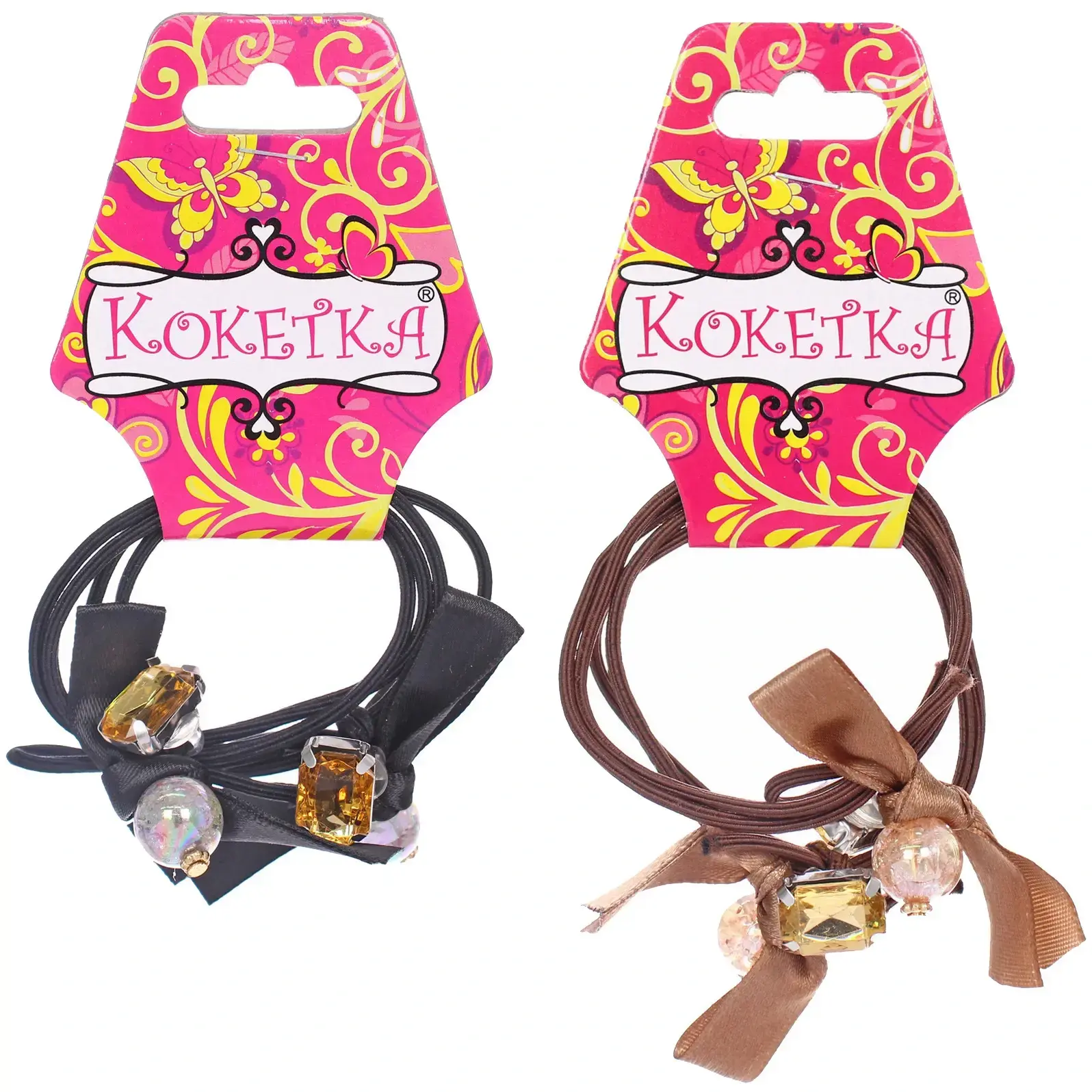 Резинки для волос «Эланта» представлены в комплекте из двух штук, выполненных в черном и коричневом цветах. Они украшены декоративными элементами, такими как бантики и камни, что делает их не только практичными, но и стильными. Эти резинки подходят для всех типов волос и могут использоваться для создания различных причесок — от простых хвостов до сложных укладок.