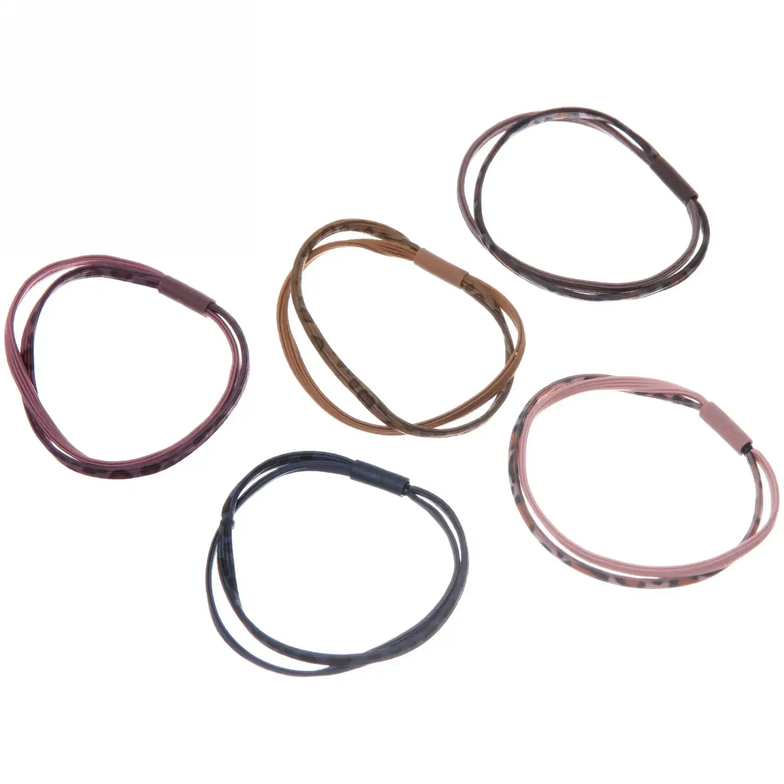 В наборе – 5 резинок диаметром примерно 6см, выполнены из эластичного текстиля. Леопардовые и однотонные расцветки делают каждую резинку заметной. Приятный блеск и гладкая поверхность подчеркивают аккуратность аксессуара.