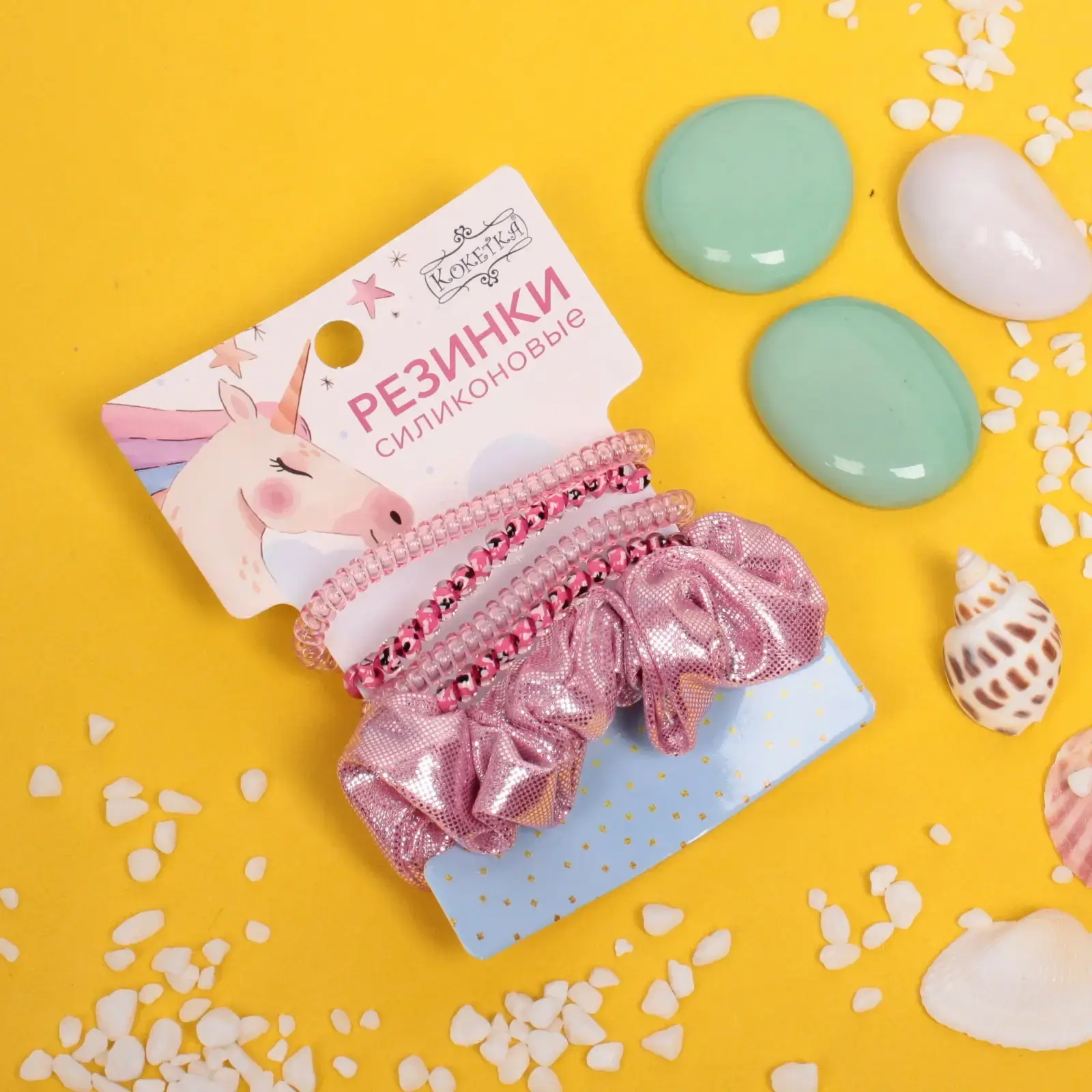 В комплект входят 5 резинок диаметром 6 см, выполненных из качественного силикона. Каждая резинка имеет уникальный дизайн: две прозрачные с блестящими элементами и одна насыщенно-розовая с эффектом глиттера. Упаковка оформлена в пастельных тонах с изображением единорога, что делает ее отличным подарком для любителей ярких аксессуаров.