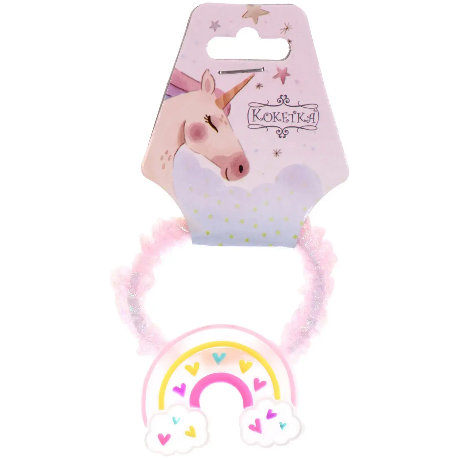 Размер резинки составляет 6,5 см в диаметре, что делает её удобной для ношения и хранения. Декоративные элементы выполнены в светлых, радужных цветах, что делает аксессуар универсальным для различных нарядов. Упаковка оформлена в виде подковы с изображением единорога, что добавляет дополнительный шарм и делает резинку отличным подарком для девочек.