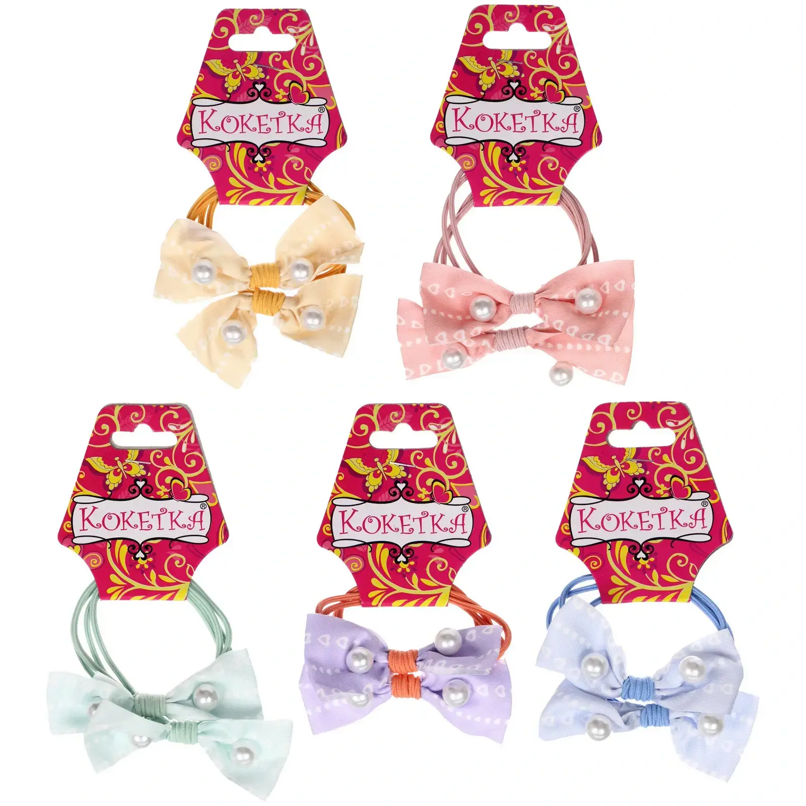 Каждая резинка украшена бантиком и декоративными бусинами, что придает им особый шарм. В комплект входят две резинки, выполненные в пяти различных цветах: желтом, розовом, зеленом, сиреневом и голубом. Это позволяет легко сочетать их с любым нарядом. Резинки изготовлены из качественных материалов, что гарантирует их долговечность и надежность.