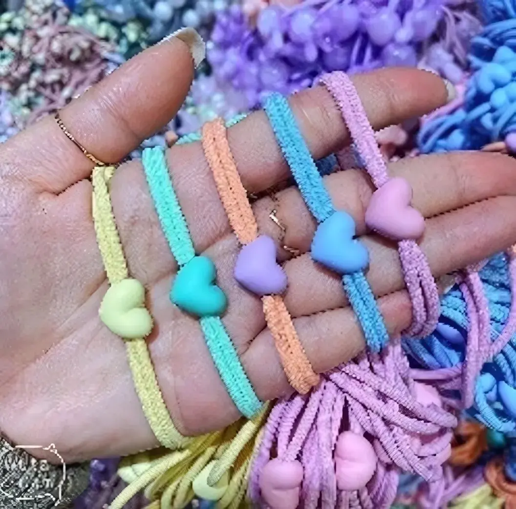 Резинки подходят для всех типов волос и идеально удерживают прическу в течение всего дня. Они легко надеваются и снимаются, не повреждая волосы. Набор состоит из двух резинок, каждая из которых украшена пластиковым сердечком, что добавляет игривости и оригинальности.