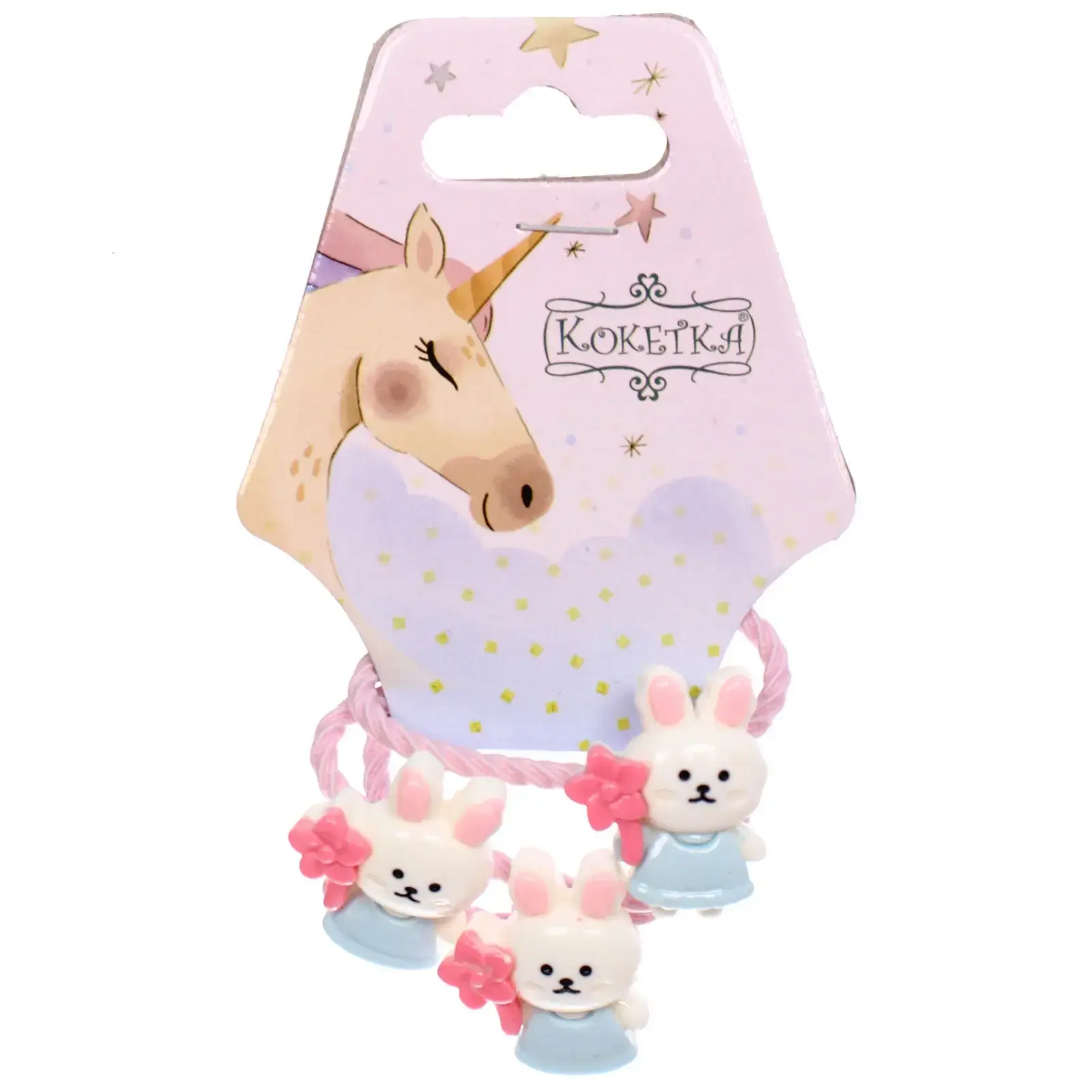 В набор входят три резинки, каждая из которых украшена фигуркой зайца в голубом платье с цветком. Диаметр резинок составляет 3 см, что делает их удобными для использования. Изготовлены из качественного пластика и текстиля, они безопасны для детей и не вызывают аллергии.