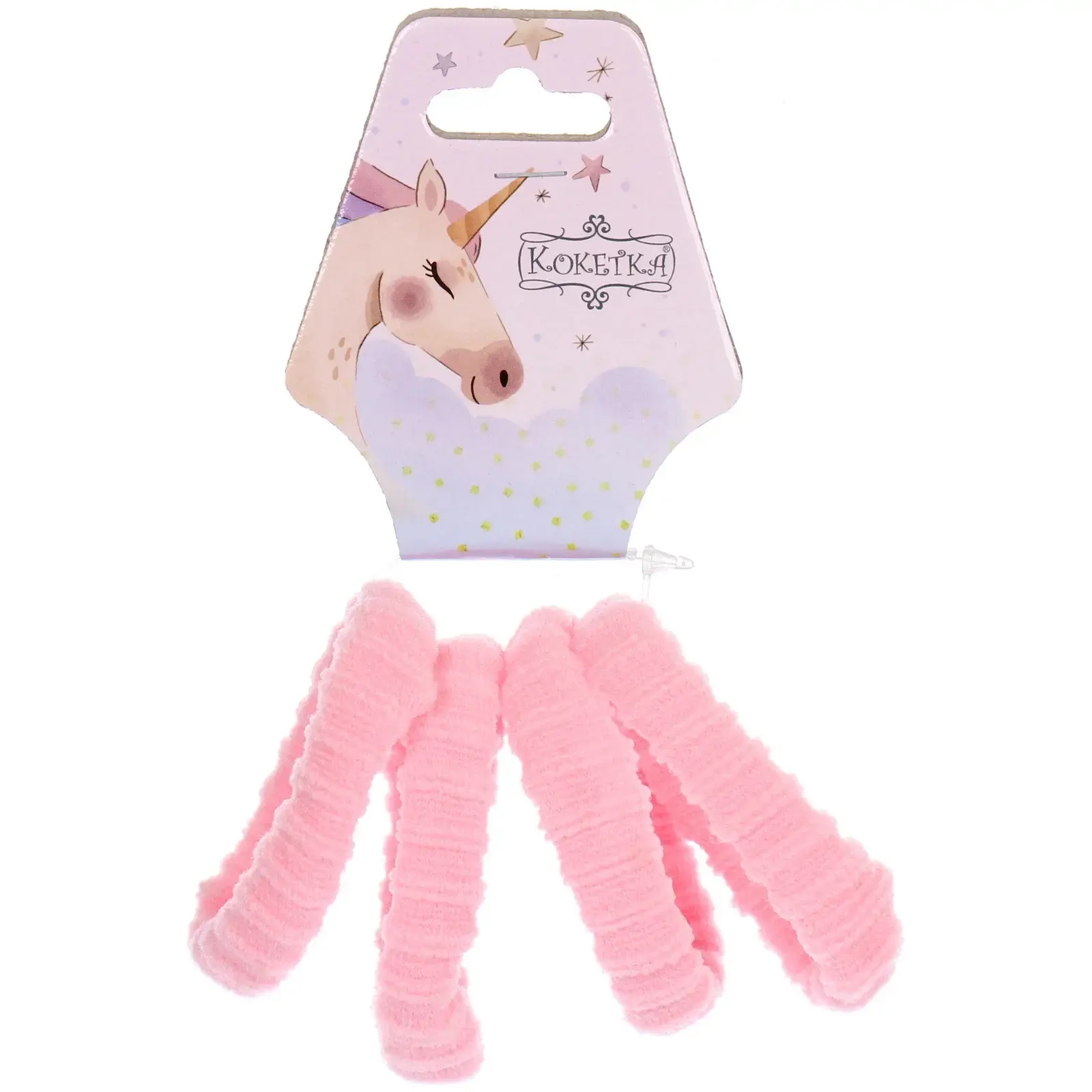 Каждая резинка имеет диаметр 4 см, что делает их универсальными для различных типов волос. Упаковка оформлена в виде карточки с рисунком единорога и звездочек, что добавляет дополнительный элемент веселья. Резинки легко хранятся и могут быть подвешены, благодаря специальному отверстию на упаковке.